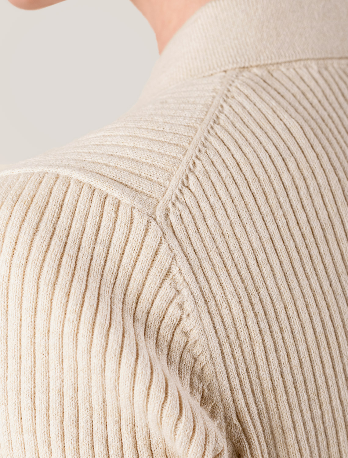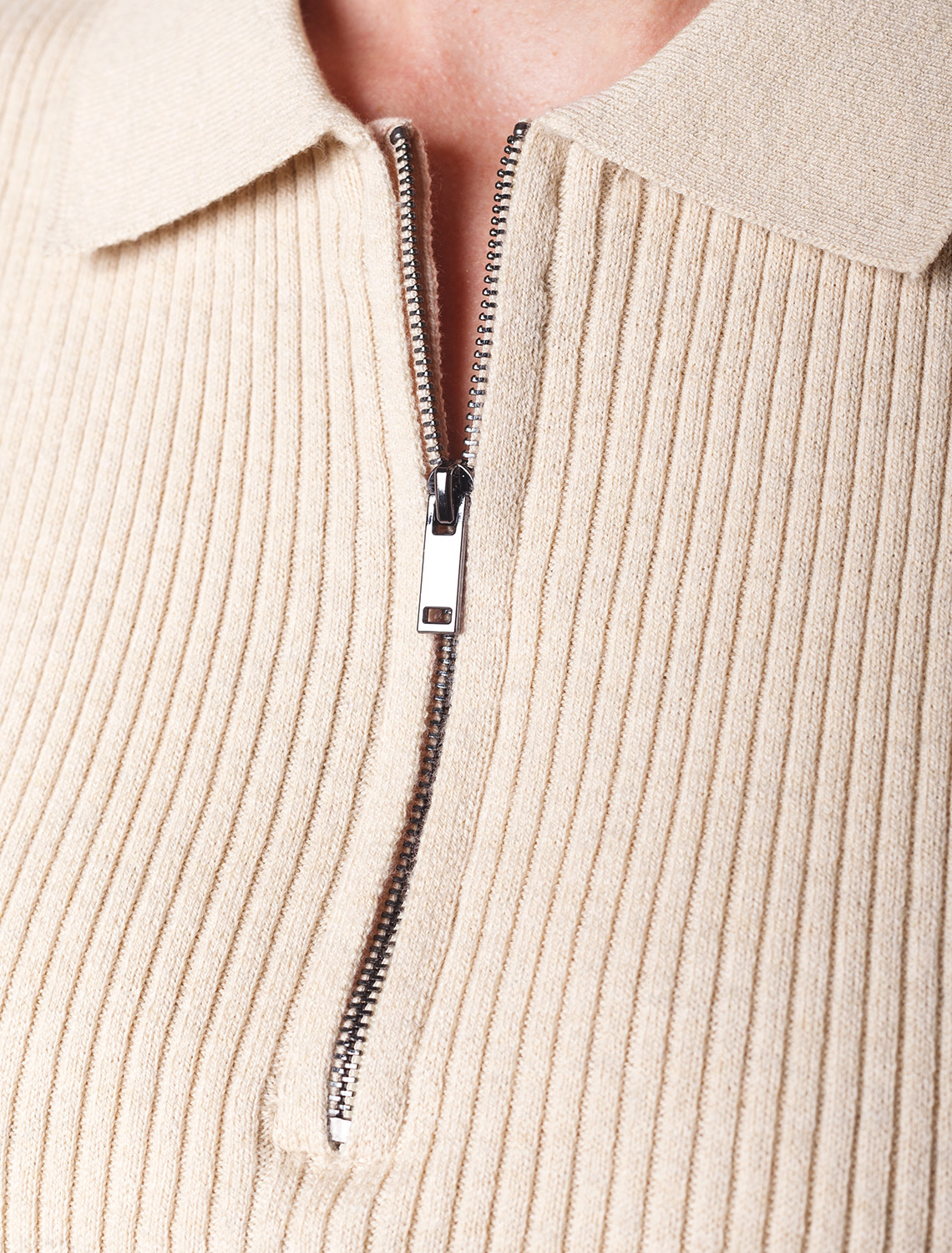 Джемпер-поло тонкой вязки выполнен из хлопка с добавлением кашемира. Модель с воротом как у поло дополнена застежкой на молнию и металлическим логотипом бренда. Мягкая и очень приятная пряжа в рубчик совершенно не колется, сохраняет тепло при этом не перегревая, гарантируя безупречный комфорт. бежевый меланж