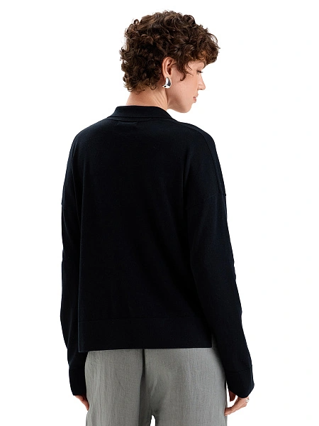 Особенности: Антибактериальные свойства, Воротник-поло, Гипоаллергенный материал, Легкая нежная пряжа, Мягкие манжеты, Не колется, Не стесняет движений, Невесомый базовый свитер, Нежный к коже, Нейтрализация запахов, Премиальный трикотаж, Разрезы по бокам внизу изделия, Свободный силуэт, Универсальная модель