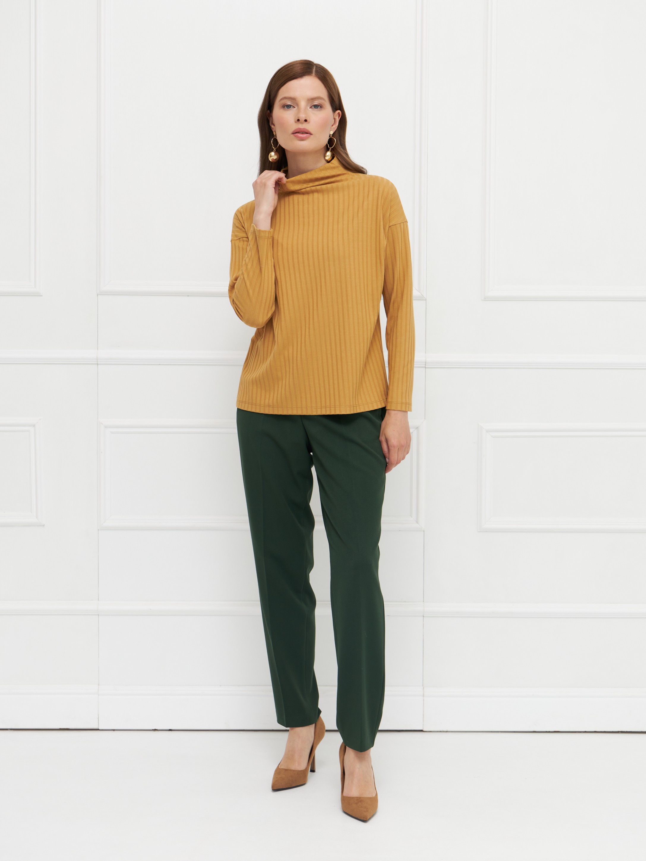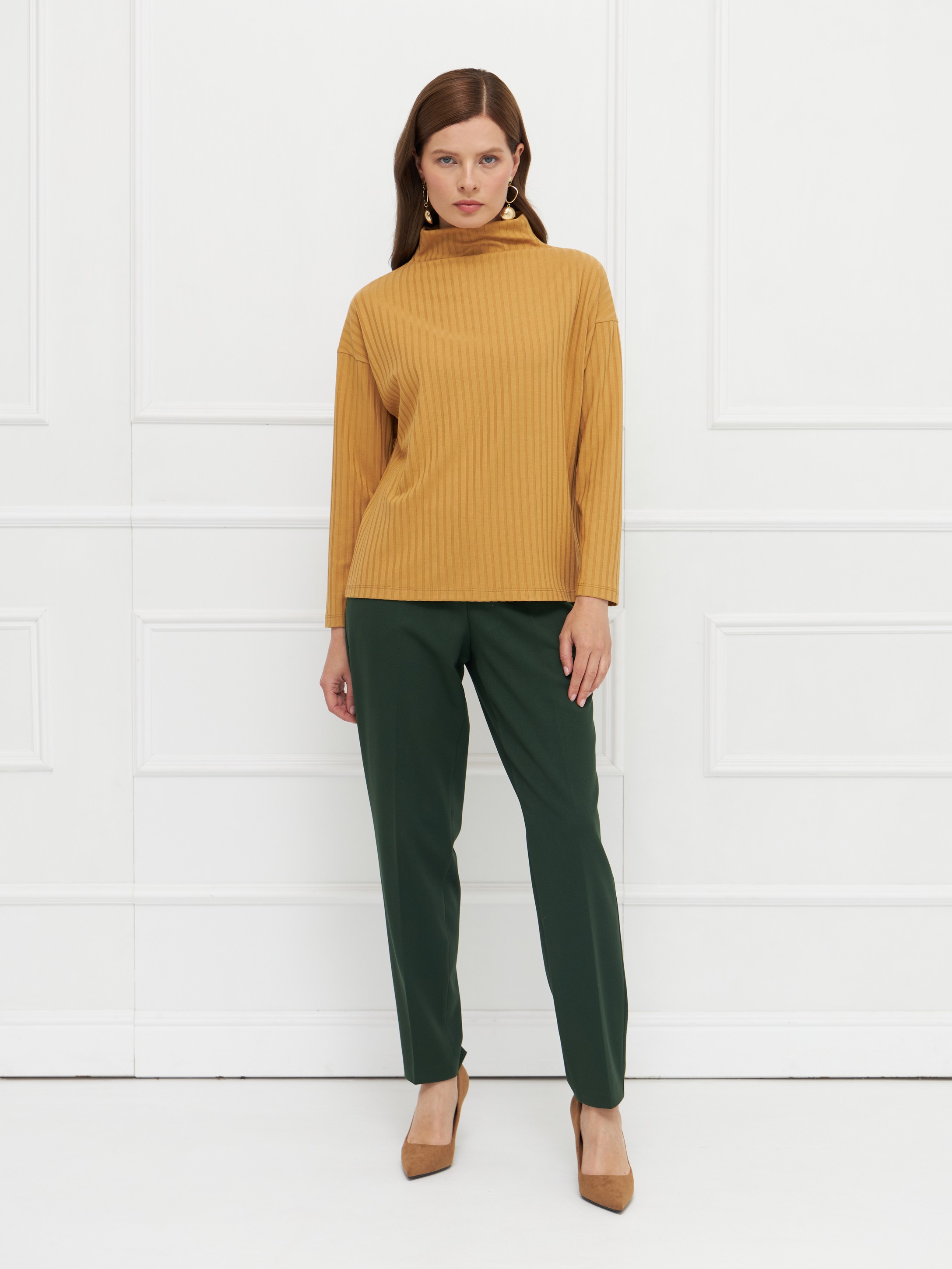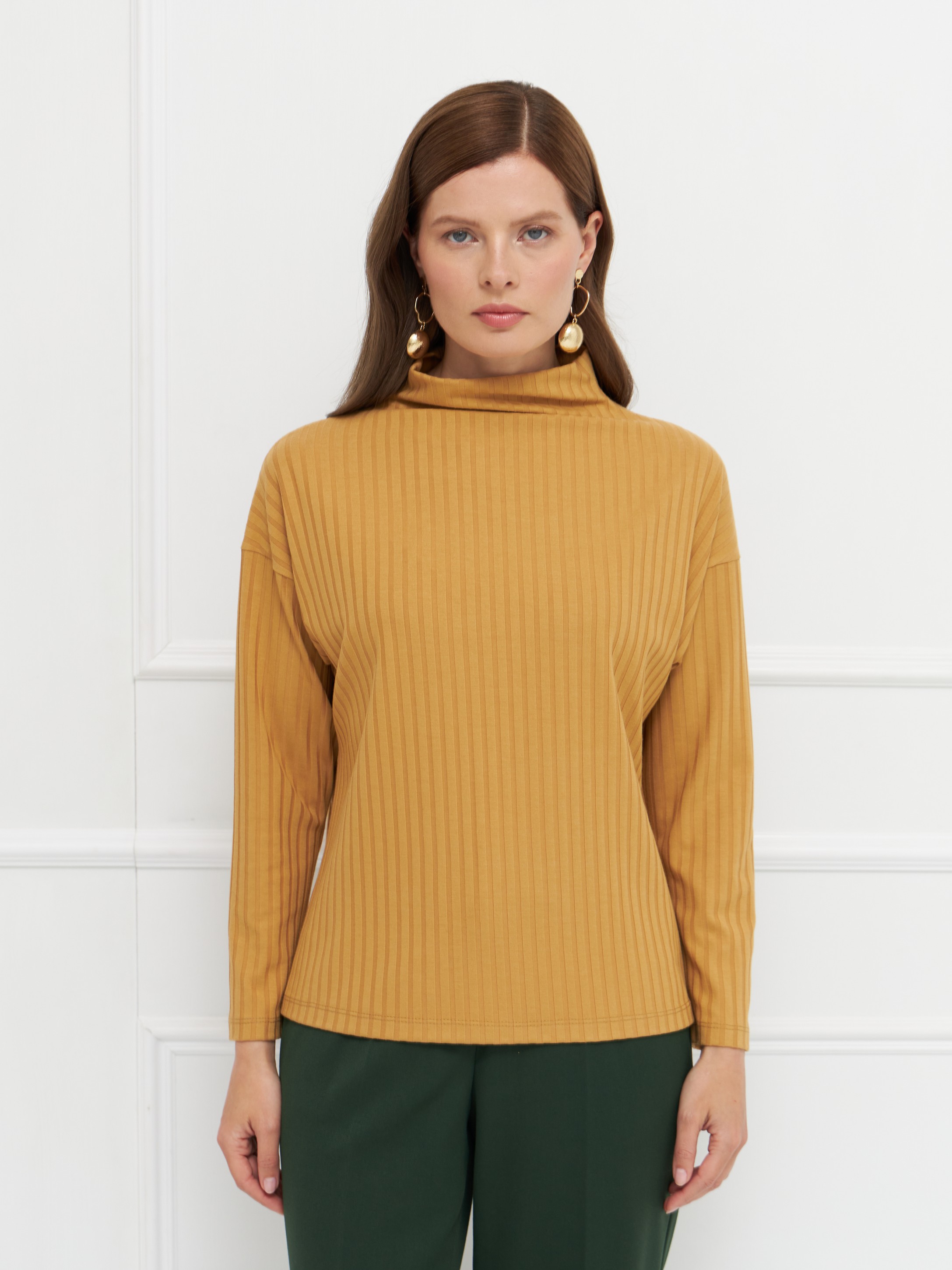 Джемпер выполнен из мягкого трикотажа в рубчик горчичного цвета, приятного к телу и обеспечивающего комфорт. Модель имеет цельнокроеный воротник и спущенную линию плеча, что создаёт расслабленный и современный силуэт. Прямой крой обеспечивает свободу движений и универсальность в сочетаниях. Уютная и лаконичная водолазка станет базовой вещью для повседневного и делового гардероба. На фото в паре Брюки Б-704 ЗМО(О5).