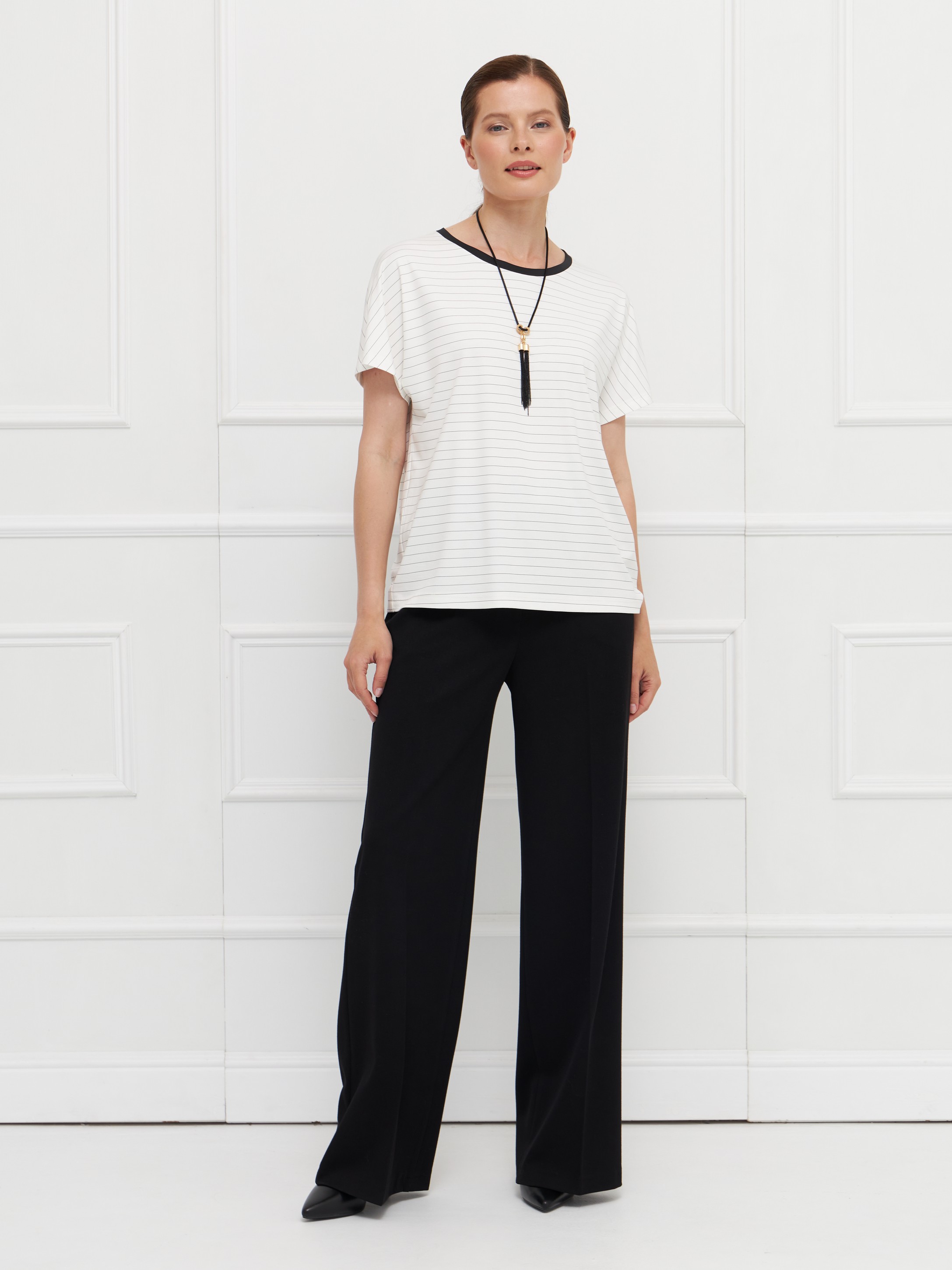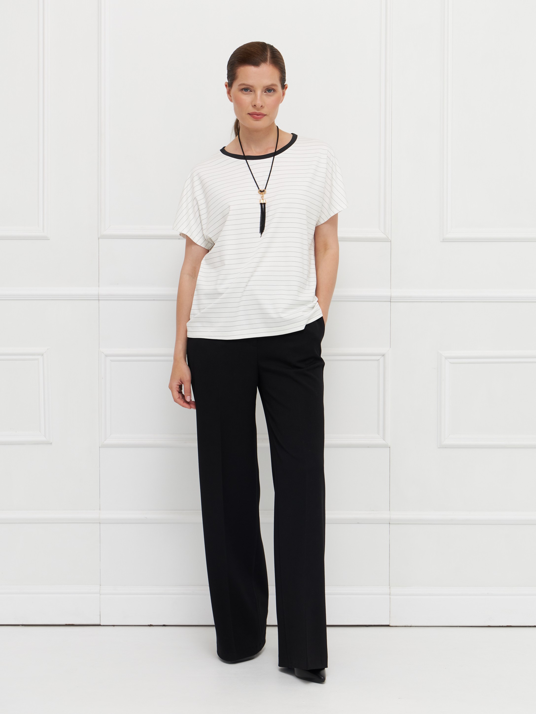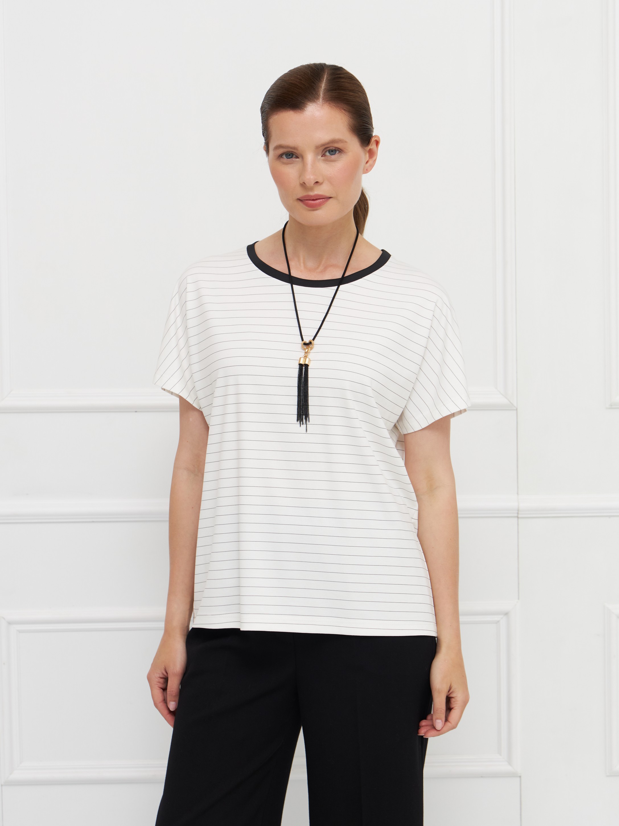 Джемпер выполнен из тонкого трикотажа на основе вискозы — материал мягкий, гладкий и комфортный в носке. Модель имеет прямой крой и короткие цельнокроеные рукава, что придает образу легкость и современное звучание. Молочный фон с тонкой горизонтальной полоской делает джемпер универсальным и визуально освежает. Горловина оформлена черной бейкой, создающей четкий графичный акцент. Благодаря лаконичному дизайну и нейтральной палитре модель легко сочетается с юбками и брюками в деловом и повседневном стилях. На фото в паре Брюки Б-2049 ГБЧ(О5).