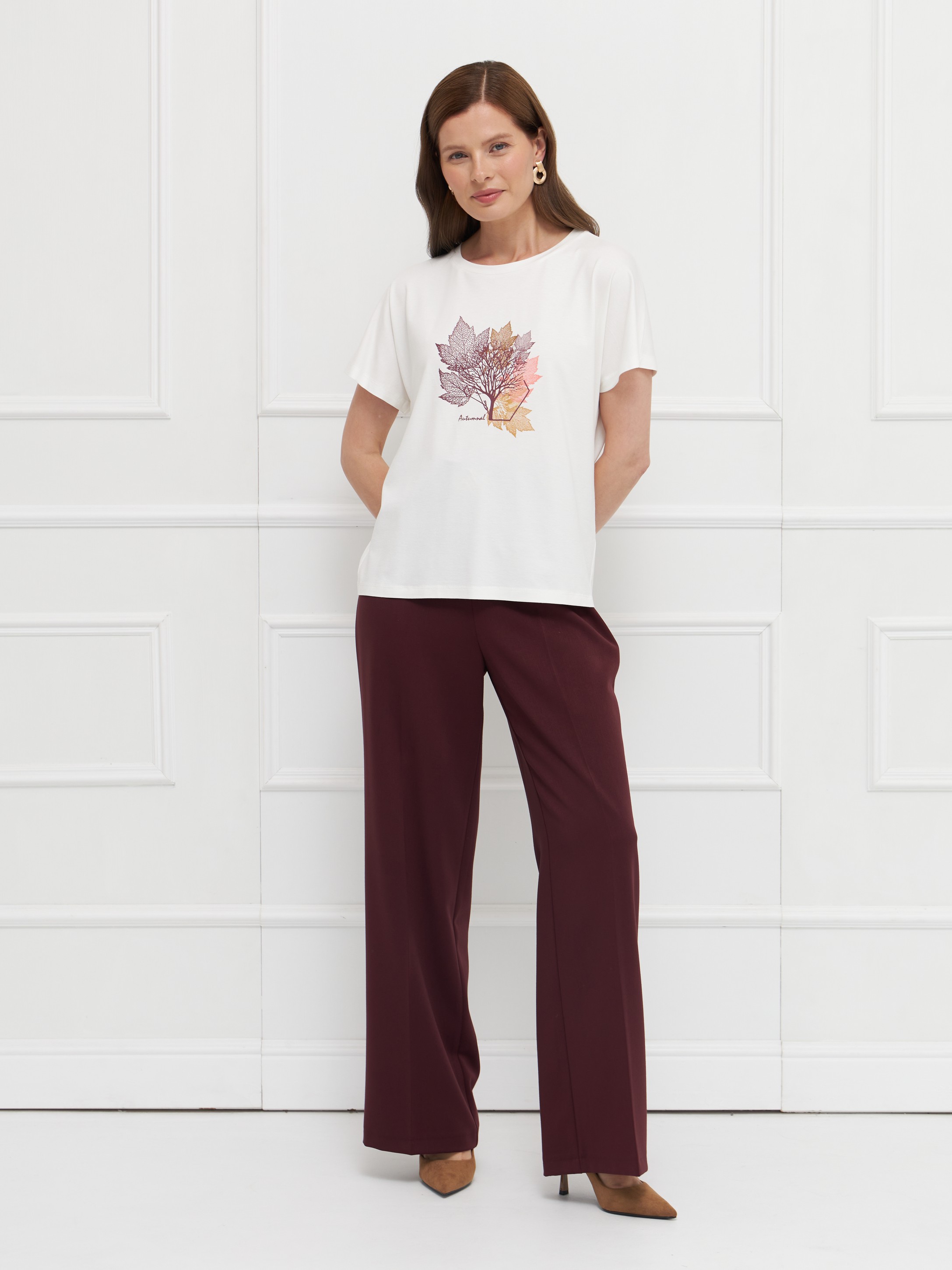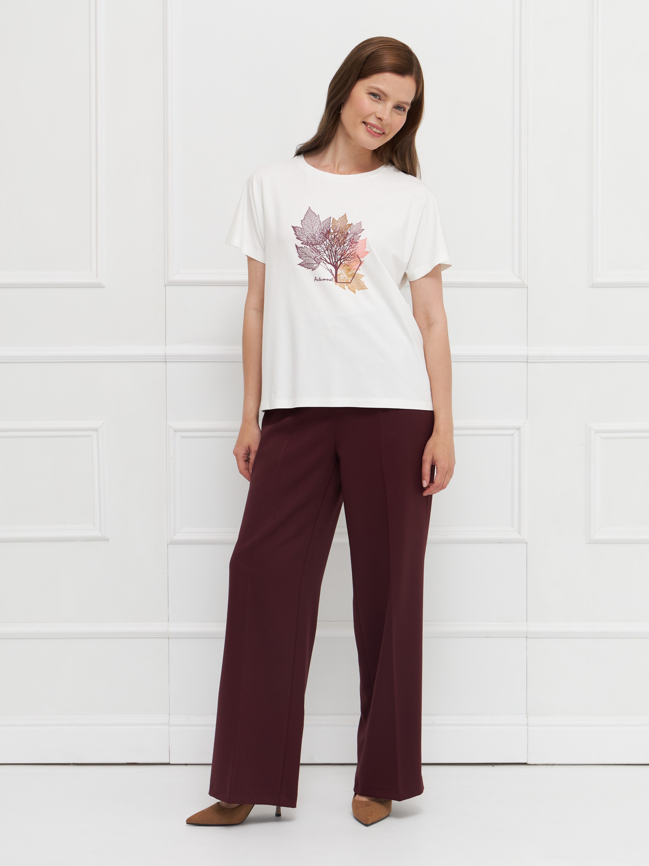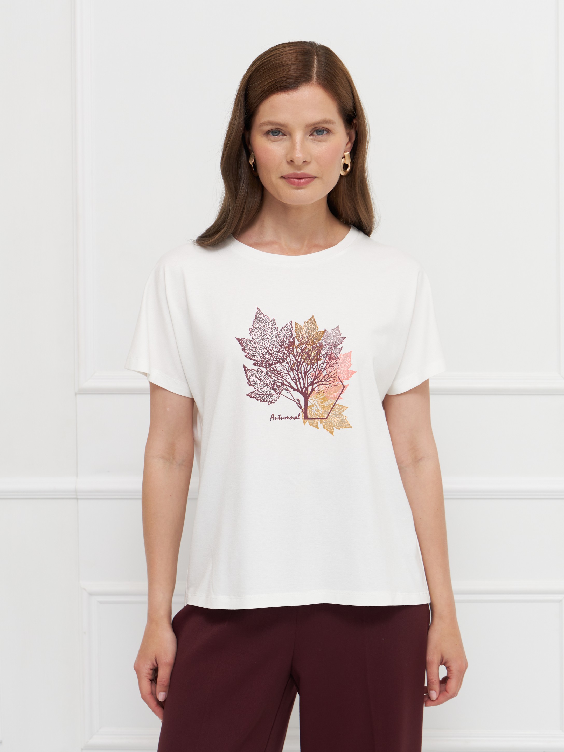 Джемпер с короткими цельнокроеными рукавами, выполненный из мягкого вискозного трикотажа. Модель с круглой горловиной и прямым кроем обеспечивает комфорт и свободу движений. Украшен дизайнерским принтом, передающим атмосферу осеннего настроения. На фото в паре Брюки Б-2051 ГУН(О5).