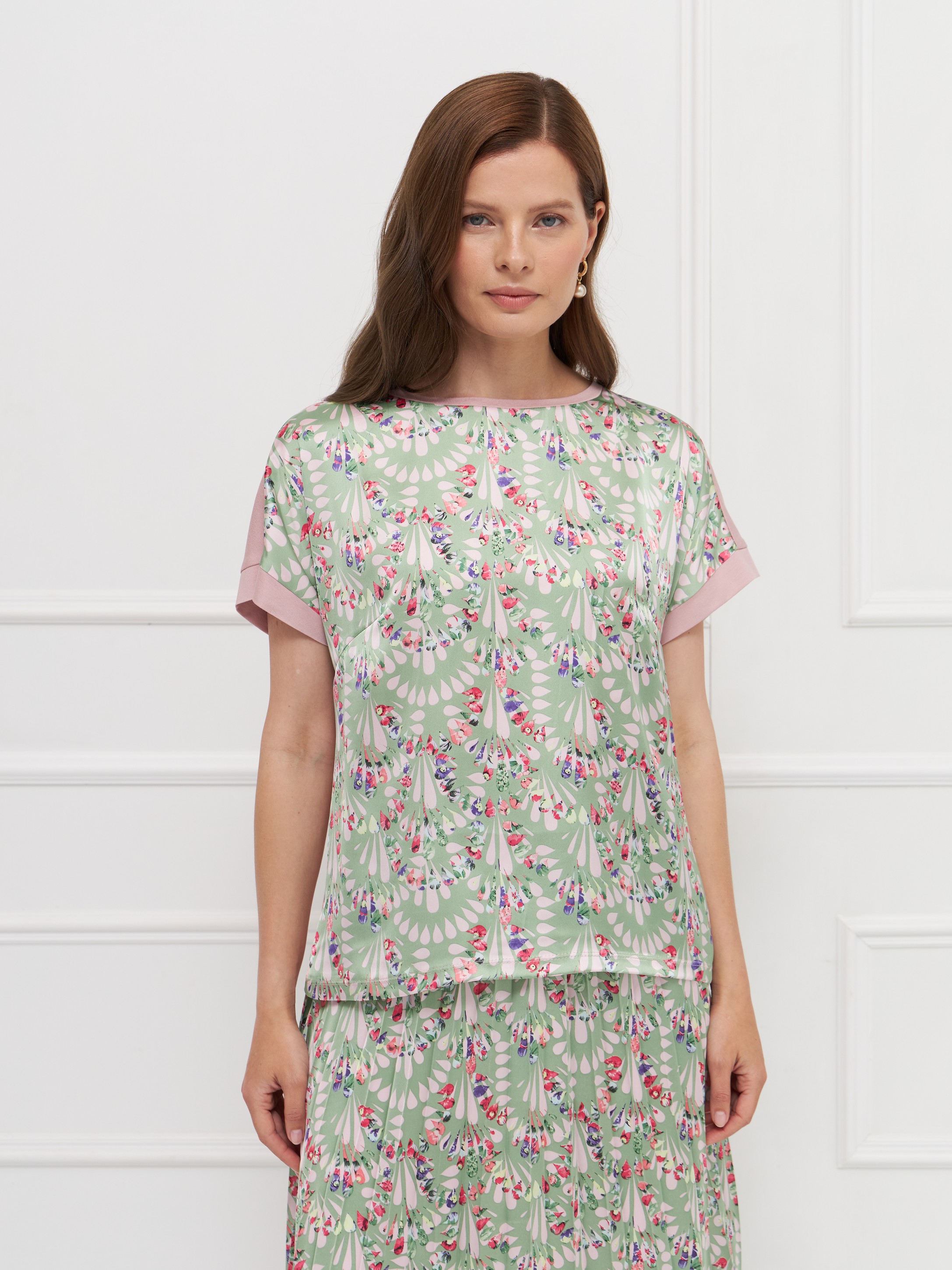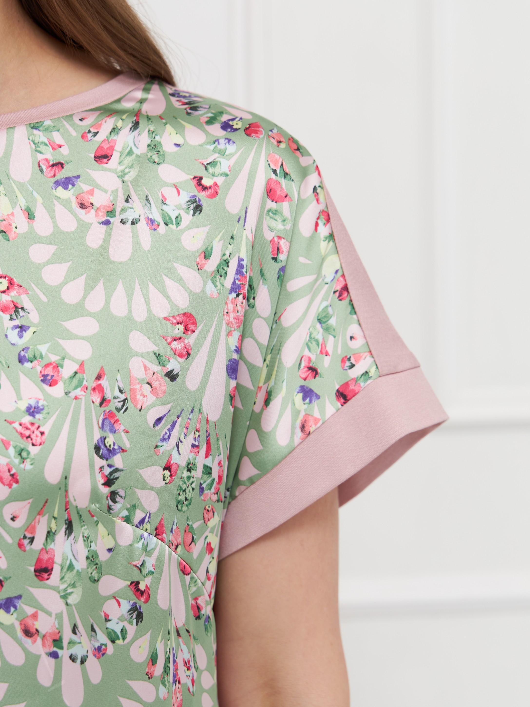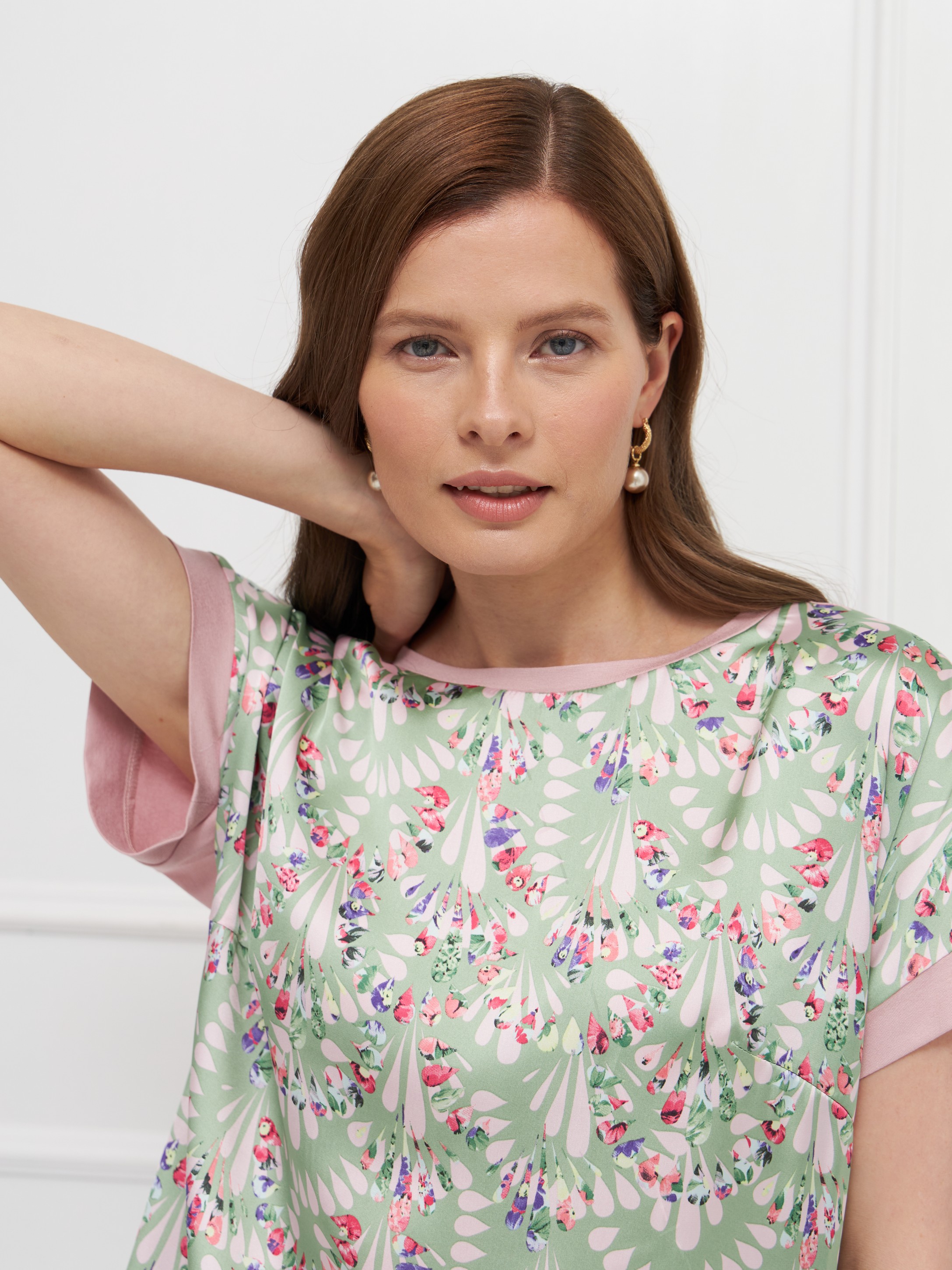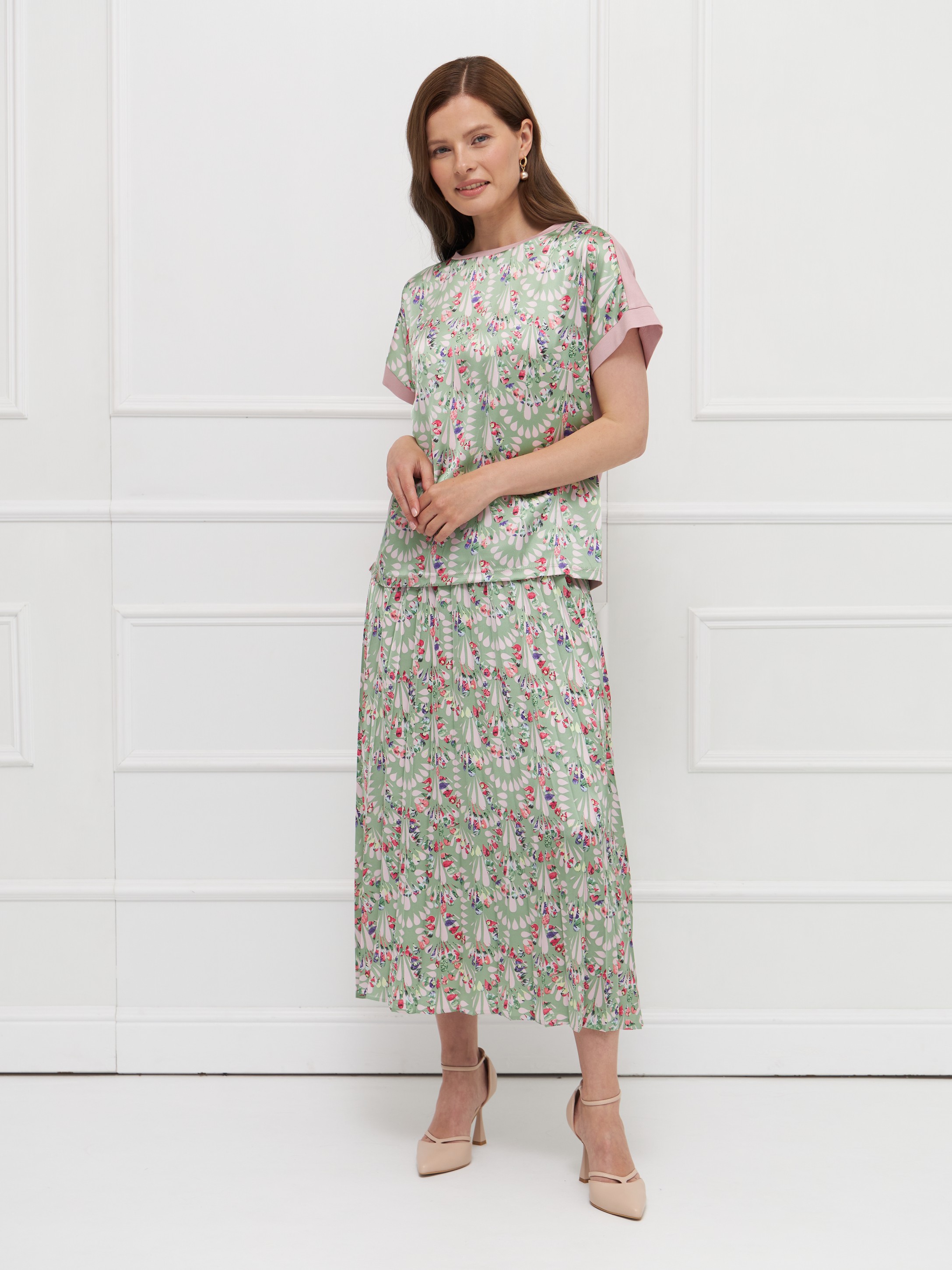 Блузка прямого силуэта выполнена из мягкого вискозного трикотажа розового цвета, который обеспечивает комфорт и аккуратную посадку. Модель без рукавов со спущенной линией плеча дополнена аккуратными манжетами, придающими завершенность образу. Полочка из искусственного шелка с авторским принтом служит выразительным акцентом. Лаконичный крой и сочетание фактур делают блузку универсальной для повседневных и офисных комплектов. На фото в паре Юбка А-2031 ПЛЕ(О5).