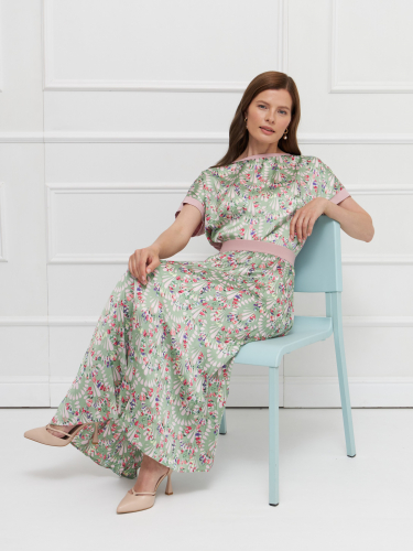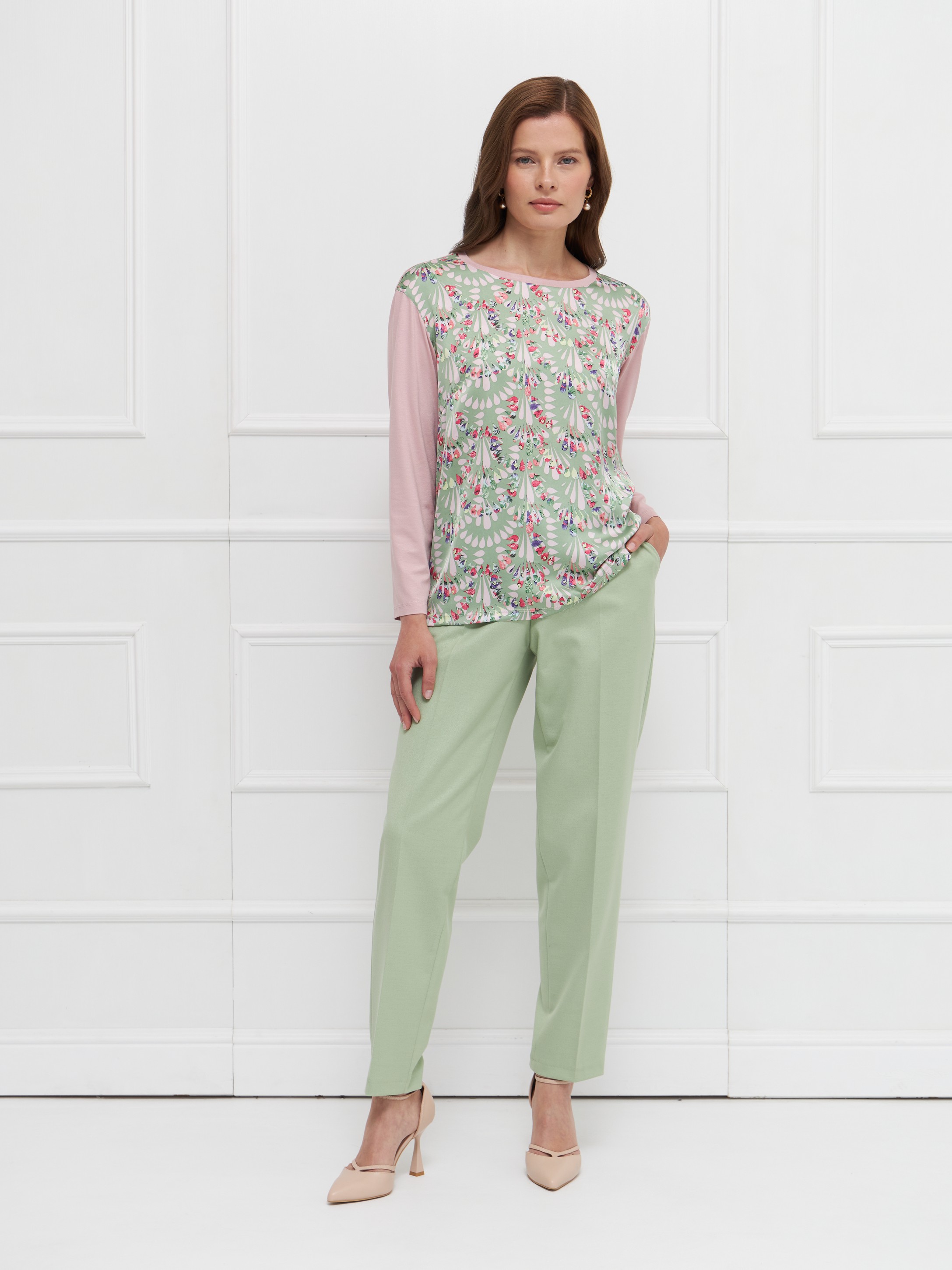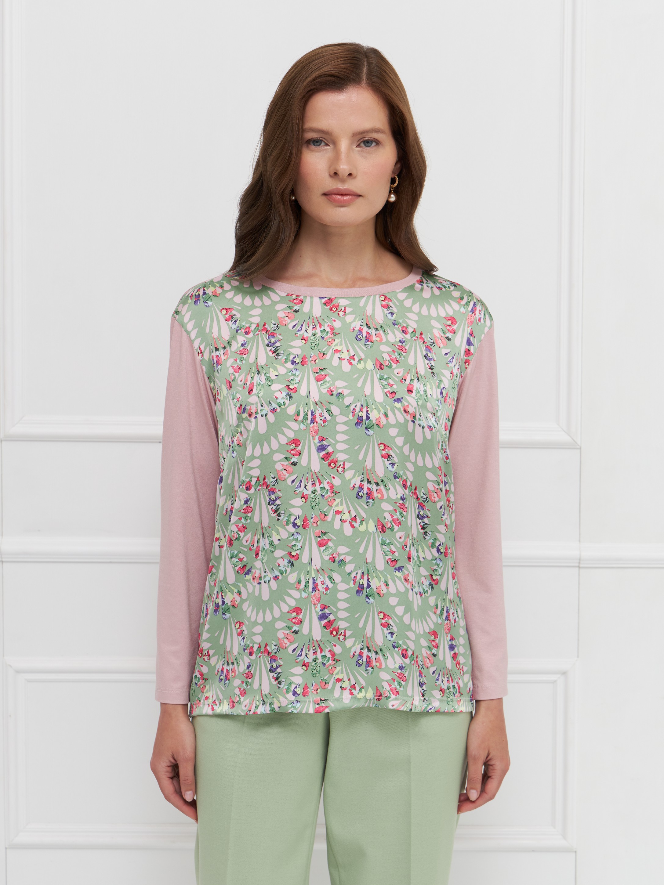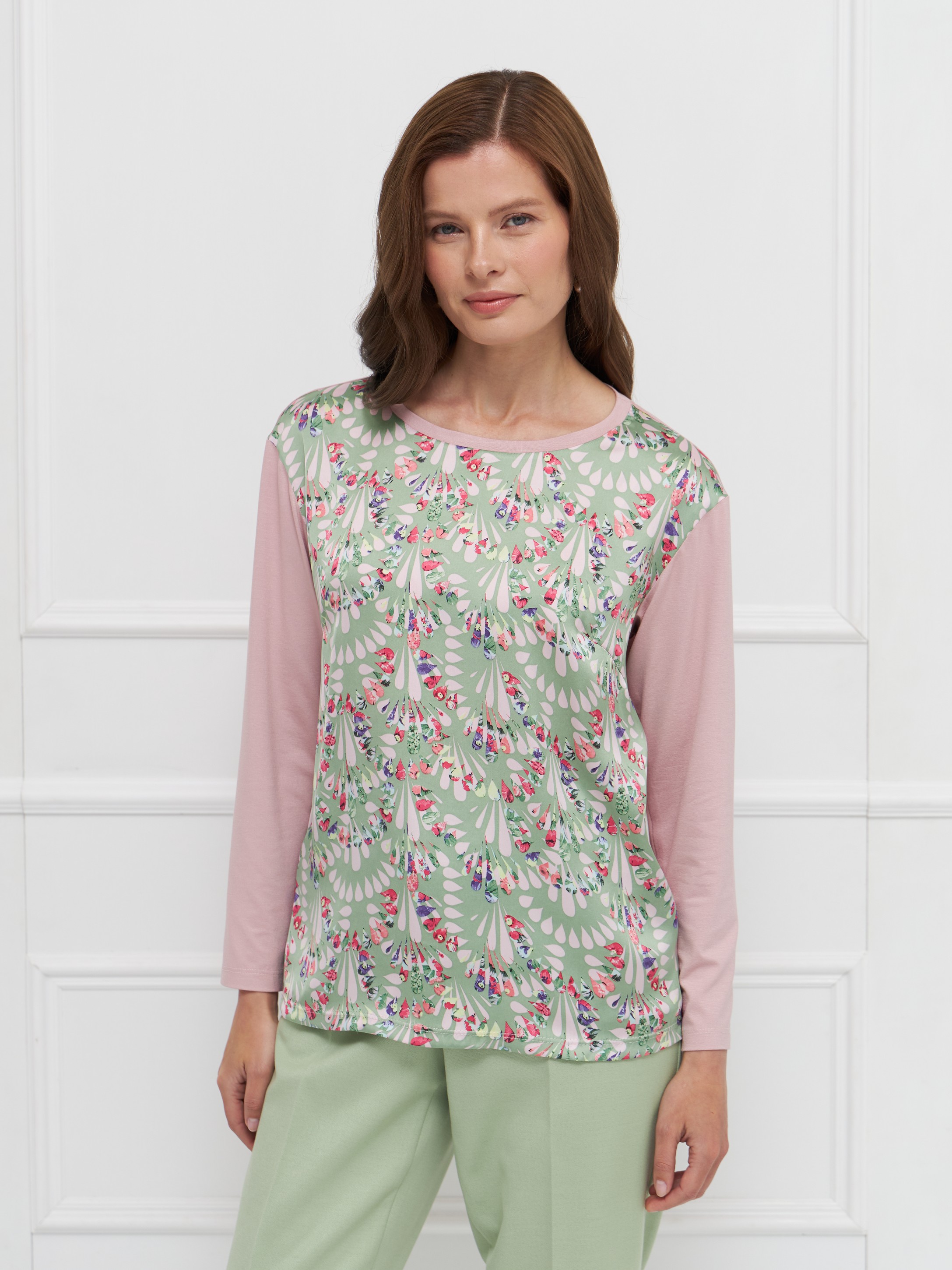 Блузка прямого силуэта выполнена из мягкого вискозного трикотажа розового цвета, обеспечивающего комфорт и приятное прилегание к телу. Длинные рукава и круглая горловина придают модели лаконичность. Полочка из искусственного шелка с авторским принтом — выразительный акцент, подчеркивающий индивидуальность. Универсальная модель для повседневных и деловых образов. На фото в паре Брюки Б-704 ОЛИ(О5).