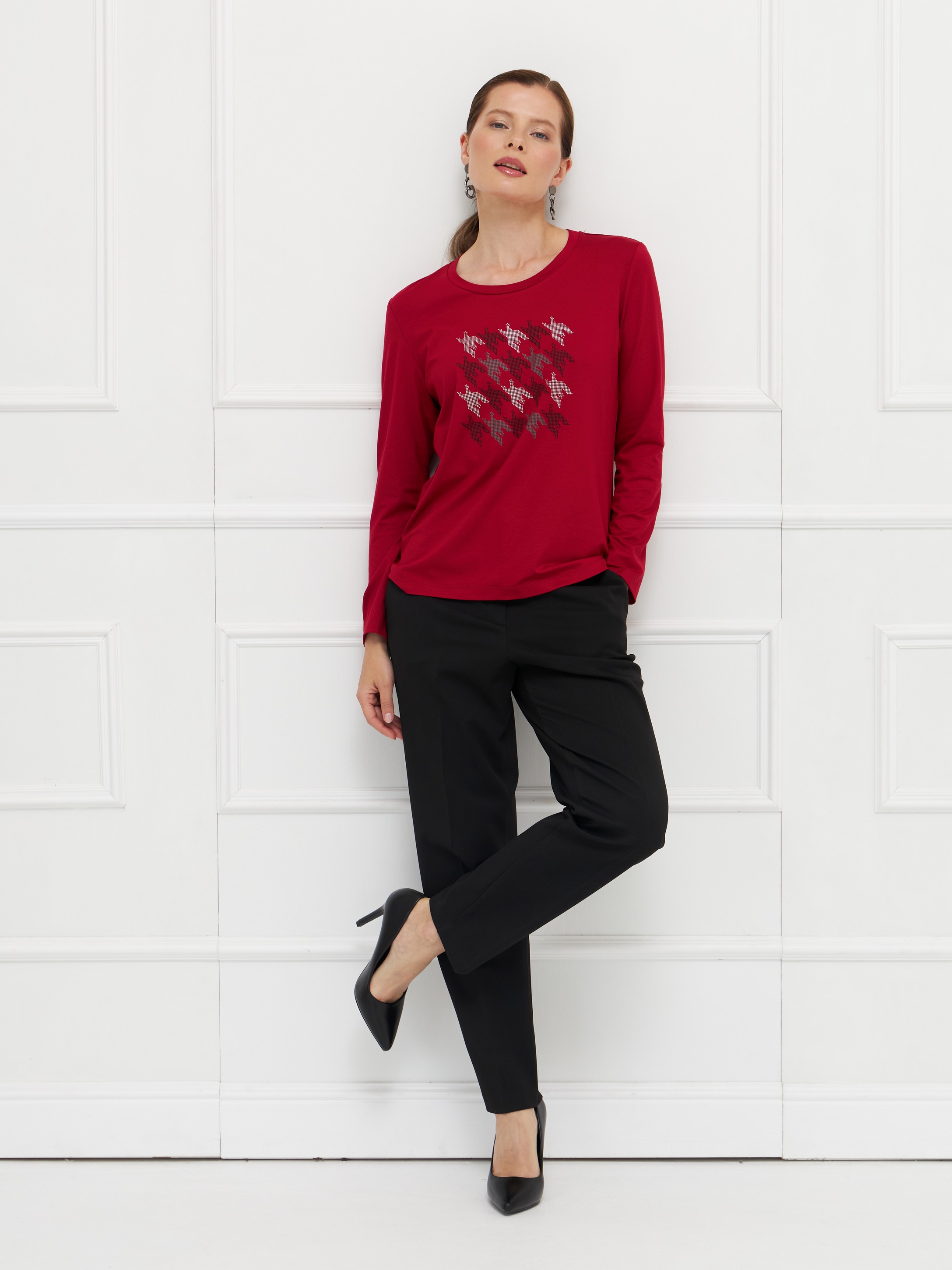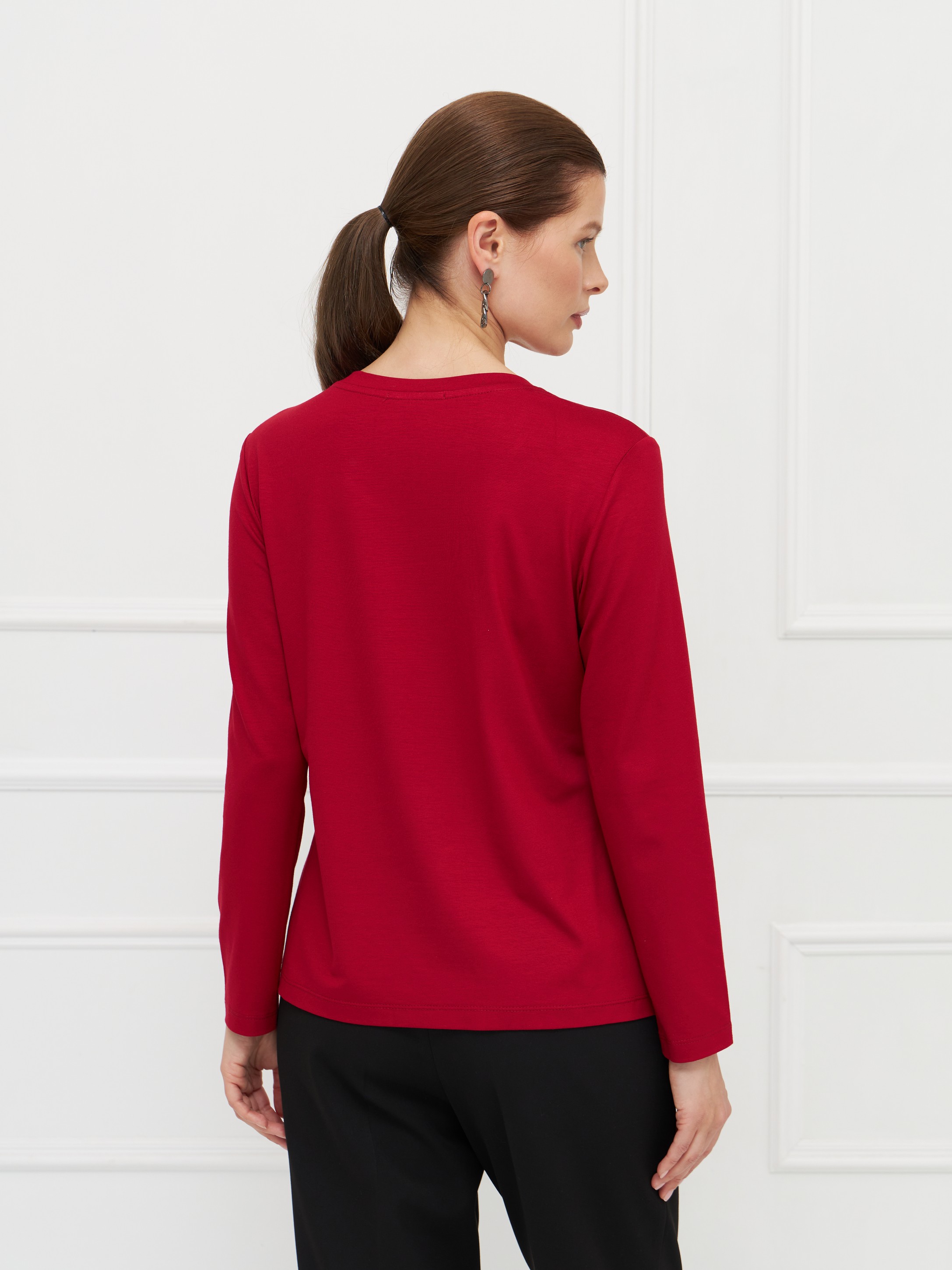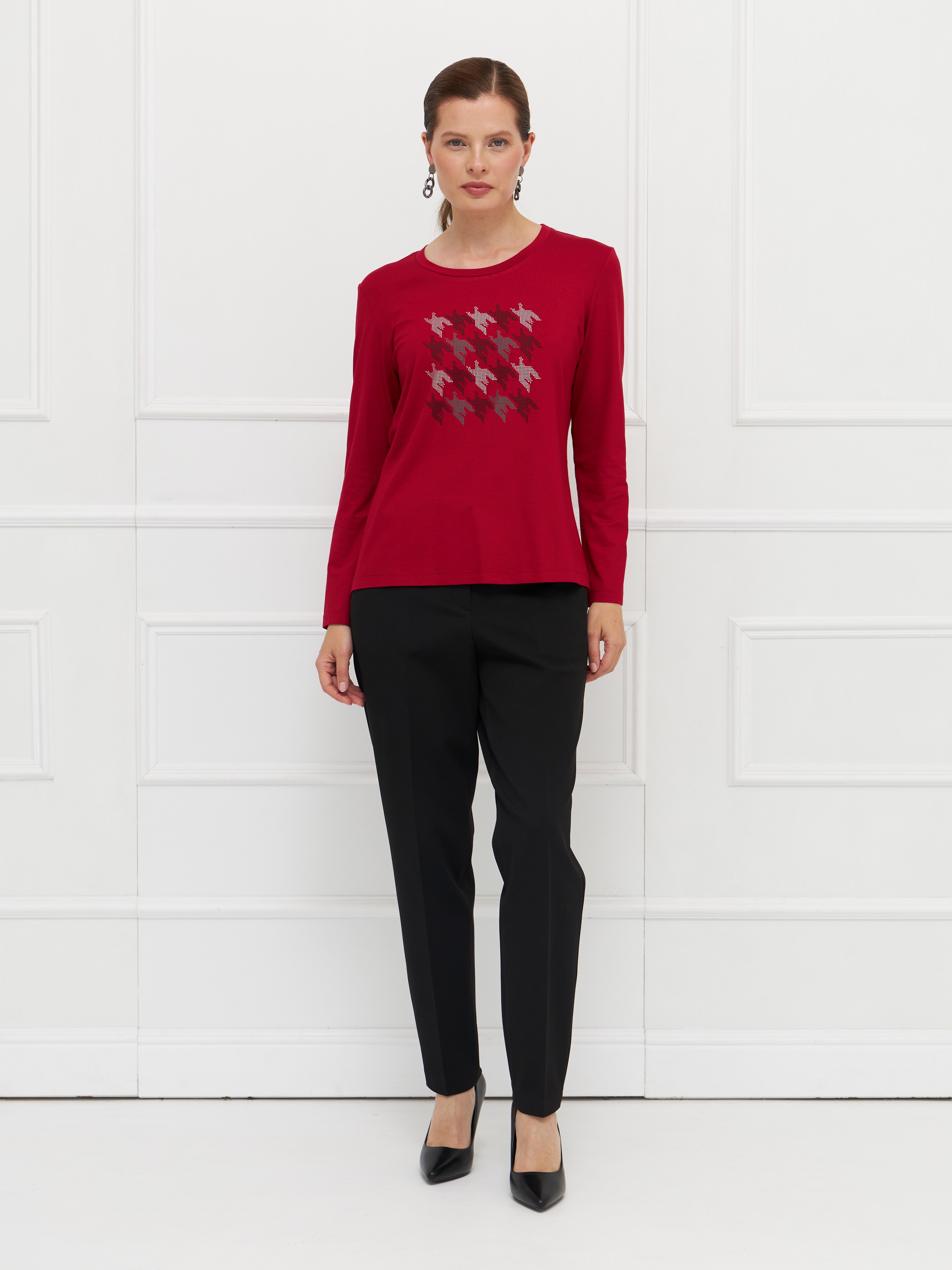Джемпер выполнен из красного вискозного трикотажа — мягкой и эластичной ткани, обеспечивающей комфорт в течение дня. Полуприлегающий крой подчёркивает фигуру, не стесняя движений. Длинные втачные рукава и круглая горловина придают модели сдержанный и универсальный вид. Яркий акцент — дизайнерский принт, который добавляет образу индивидуальности. Джемпер легко сочетается с базовыми вещами гардероба и подойдёт как для офиса, так и для повседневных комплектов. На фото в паре Брюки Б-703 АКД(О5).