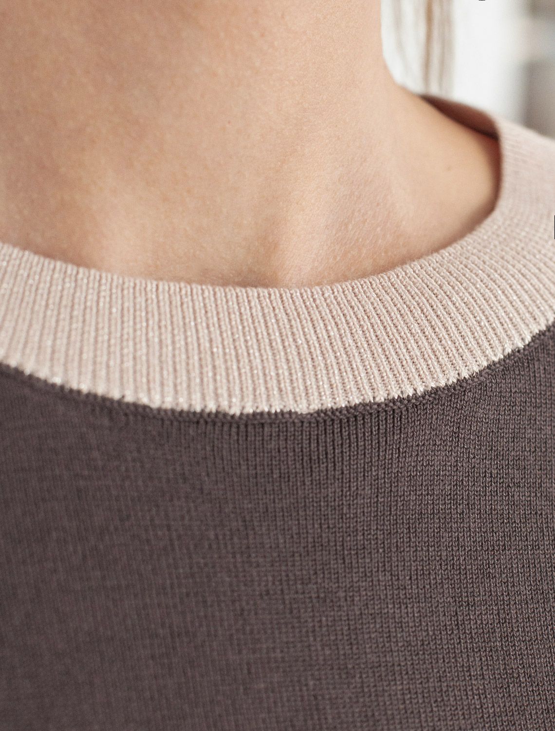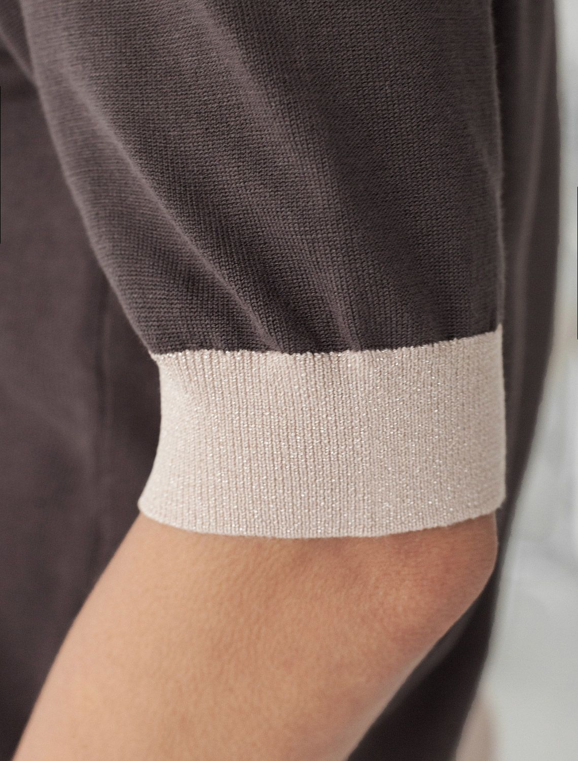 Легкий джемпер кофейного цвета с круглым вырезом идеально подходит на весну и лето. Тонкая вязка из вискозы дарит приятный комфорт и ощущение свежести в теплую погоду. Полуприлегающий крой подчеркивает силуэт, а универсальная длина позволяет сочетать джемпер с разными элементами гардероба. Контрастная отделка с мягким люрексом добавляет стильный акцент, создавая выразительный образ. Деликатное мерцание придает праздничное настроение, но не выглядит слишком ярко или вызывающе. Такой элемент украшения позволяет носить нарядный джемпер и на особых мероприятиях. Джемпер отлично смотрится на больших размерах благодаря продуманному крою и полуприлегающему фасону. Этот джемпер с коротким рукавом станет незаменимой частью гардероба в сезоны, когда хочется легкости и элегантности одновременно. Лаконичный дизайн обеспечивает простоту комбинирования с другими вещами и будет универсальной базой для создания разнообразных комплектов — от офисного до непринужденного городского стиля.