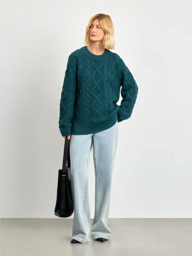 Свитер с косами снова актуален. Объемная крупная вязка, узор и фактура задают настроение естественности. Его поддерживают свободный силуэт, а также крупный скруглённый V-вырез. Дышащий и комфортный в носке материал наполовину состоит из хлопка. Молочный цвет даёт широкую сочетаемость, позволяя сочетать с самыми разными вариантами низа