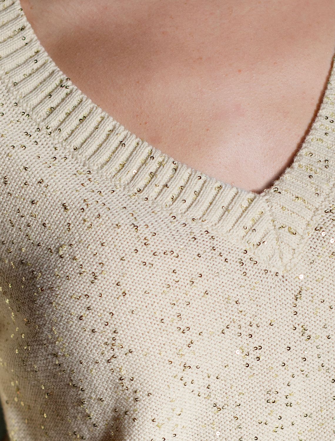 Легкий джемпер бежевого цвета с V вырезом и коротким рукавом выполнен из хлопковой пряжи с вкраплением сияющих пайеток, что придает особую изысканность. Нарядный джемпер связан изнанкой, пряжа отличается легкостью и приятной текстурой, совершенно не колется, обеспечивает комфорт даже при длительном использовании, а натуральные волокна поддерживают оптимальный температурный баланс. Полуприлегающий крой подчеркивает женственный силуэт, а манжеты на рукавах и по низу гармонично завершают дизайн, создающий аккуратный образ. Умеренно открытое декольте вытягивает шею и подчеркивает ее изящество. Стильный джемпер подойдет девушкам и женщинам больших размеров, в нем вы будете чувствовать себя уверенно и свободно в любой ситуации. Мерцающий эффект пайеток добавляет образу выразительности и индивудуальности. Сочетайте джемпер в романтическом образе с пышной юбкой, в более строгом с широкими брюками. Мерцающее полотно добавляет особого шарма вашему образу, делая его уместным как на праздник, так и для повседневного выхода. Новый год, вечеринка или любое другое мероприятие пройдут ярко — сияющие пайетки создают ощущение праздника в каждом движении.