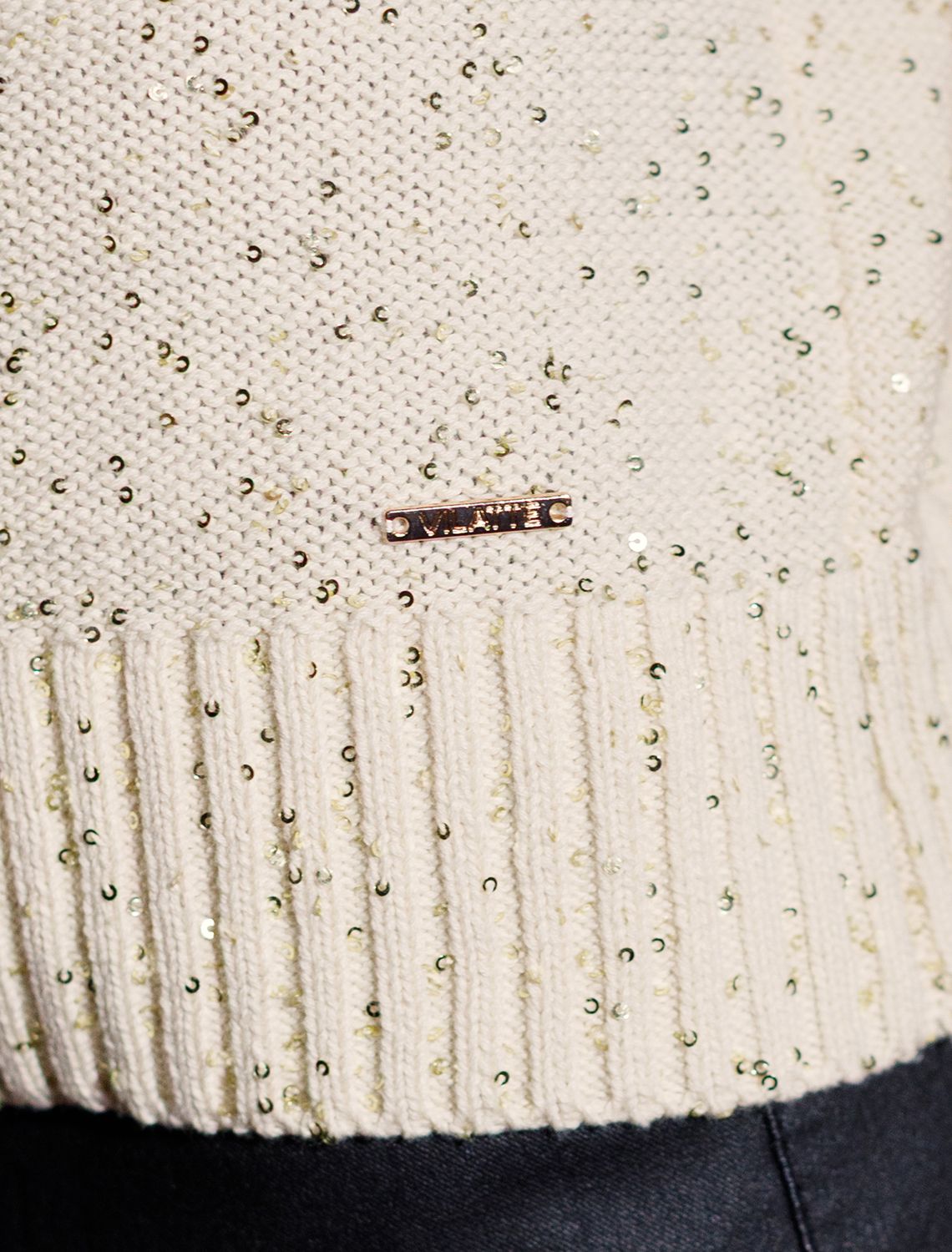 Легкий джемпер бежевого цвета с V вырезом и коротким рукавом выполнен из хлопковой пряжи с вкраплением сияющих пайеток, что придает особую изысканность. Нарядный джемпер связан изнанкой, пряжа отличается легкостью и приятной текстурой, совершенно не колется, обеспечивает комфорт даже при длительном использовании, а натуральные волокна поддерживают оптимальный температурный баланс. Полуприлегающий крой подчеркивает женственный силуэт, а манжеты на рукавах и по низу гармонично завершают дизайн, создающий аккуратный образ. Умеренно открытое декольте вытягивает шею и подчеркивает ее изящество. Стильный джемпер подойдет девушкам и женщинам больших размеров, в нем вы будете чувствовать себя уверенно и свободно в любой ситуации. Мерцающий эффект пайеток добавляет образу выразительности и индивудуальности. Сочетайте джемпер в романтическом образе с пышной юбкой, в более строгом с широкими брюками. Мерцающее полотно добавляет особого шарма вашему образу, делая его уместным как на праздник, так и для повседневного выхода. Новый год, вечеринка или любое другое мероприятие пройдут ярко — сияющие пайетки создают ощущение праздника в каждом движении.