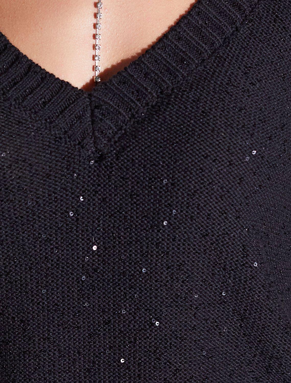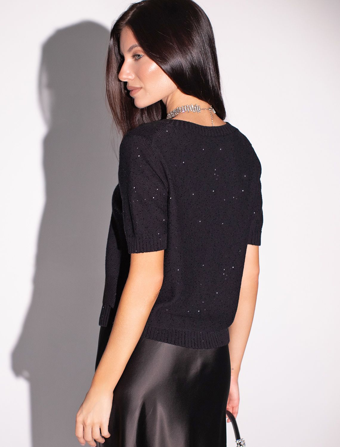 Легкий джемпер черного цвета с V вырезом и коротким рукавом выполнен из хлопковой пряжи с вкраплением сияющих пайеток, что придает особую изысканность. Нарядный джемпер связан изнанкой, пряжа отличается легкостью и приятной текстурой, совершенно не колется, обеспечивает комфорт даже при длительном использовании, а натуральные волокна поддерживают оптимальный температурный баланс. Полуприлегающий крой подчеркивает женственный силуэт, а манжеты на рукавах и по низу гармонично завершают дизайн, создающий аккуратный образ. Умеренно открытое декольте вытягивает шею и подчеркивает ее изящество. Стильный джемпер подойдет девушкам и женщинам больших размеров, в нем вы будете чувствовать себя уверенно и свободно в любой ситуации. Мерцающий эффект пайеток добавляет образу выразительности и индивудуальности. Сочетайте джемпер в романтическом образе с пышной юбкой, в более строгом с широкими брюками. Мерцающее полотно добавляет особого шарма вашему образу, делая его уместным как на праздник, так и для повседневного выхода. Новый год, вечеринка или любое другое мероприятие пройдут ярко — сияющие пайетки создают ощущение праздника в каждом движении.