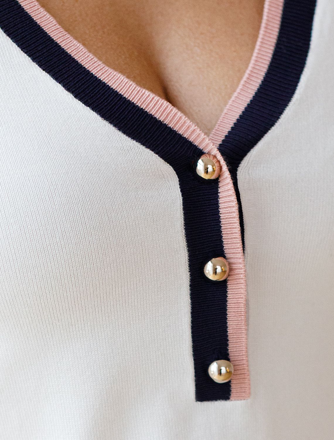 Легкий джемпер белого цвета с V-вырезом идеально подходит на весну и лето. Для производства изделия использована пряжа сердечникового прядения — когда нейлоновая нить (основа) обвивается вискозой. Вискоза обеспечивает приятную тактильность и гигроскопичность, а нейлон предотвращает растяжение и повышает устойчивость к пилингуемости. Тонкая вязка дарит приятный комфорт и ощущение свежести в теплую погоду. Полуприлегающий крой подчеркивает силуэт, а универсальная длина позволяет сочетать джемпер с разными элементами гардероба. V-вырез с пуговицами подчеркивает зону декольте и визуально вытягивает шею, делая фигуру более изящной. Контрастная отделка добавляет стильный акцент, создавая выразительный образ. Джемпер отлично смотрится на больших размерах благодаря продуманному крою и полуприлегающему фасону. Этот джемпер с коротким рукавом станет незаменимой частью гардероба в сезоны, когда хочется легкости и элегантности одновременно. Лаконичный дизайн обеспечивает простоту комбинирования с другими вещами и будет универсальной базой для создания разнообразных комплектов — от офисного до непринужденного городского стиля.