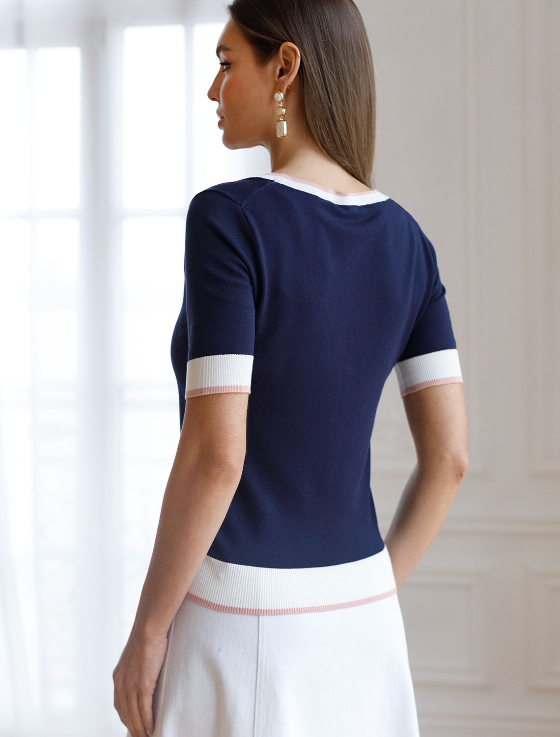 Легкий джемпер темно-синего цвета с V-вырезом идеально подходит на весну и лето. Тонкая вязка из вискозы дарит приятный комфорт и ощущение свежести в теплую погоду. Полуприлегающий крой подчеркивает силуэт, а универсальная длина позволяет сочетать джемпер с разными элементами гардероба. V-вырез с пуговицами подчеркивает зону декольте и визуально вытягивает шею, делая фигуру более изящной. Контрастная отделка добавляет стильный акцент, создавая выразительный образ. Джемпер отлично смотрится на больших размерах благодаря продуманному крою и полуприлегающему фасону. Этот джемпер с коротким рукавом станет незаменимой частью гардероба в сезоны, когда хочется легкости и элегантности одновременно. Лаконичный дизайн обеспечивает простоту комбинирования с другими вещами и будет универсальной базой для создания разнообразных комплектов — от офисного до непринужденного городского стиля.