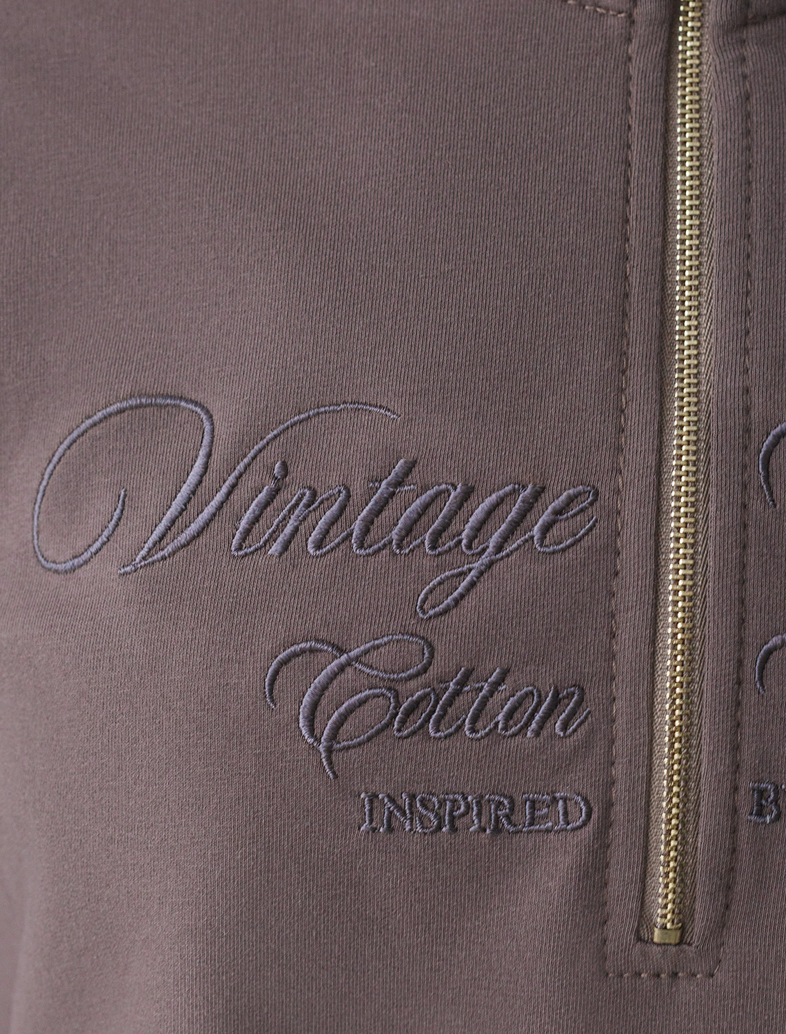 Уютный и комфортный вариант для прохладной погоды – стильный джемпер кофейного цвета с воротом на молнии. Изготовлен из премиального футера трехнитки с добавлением эластана. Материал сохраняет форму при длительном ношении и после многократных стирок, его мягкая текстура дарит ощущение уюта и тепла. Минималистичная вышивка в тон изделия в виде надписи. еревод надписи: Vinlage collection cotton club - Винтажная коллекция Хлопковый клуб. Свободный крой джемпера позволяет не ограничивать движения, что особенно важно для активного образа жизни. Подойдет на любую женскую фигуру, представлена широкая размерная линейка, большие размеры, легко комбинируется с другими вещами, создавая модные образы в стиле спорт-шик. Этот повседневный джемпер сочетает в себе удобство и актуальность, будет универсальным выбором для отдыха или прогулок. кофейный