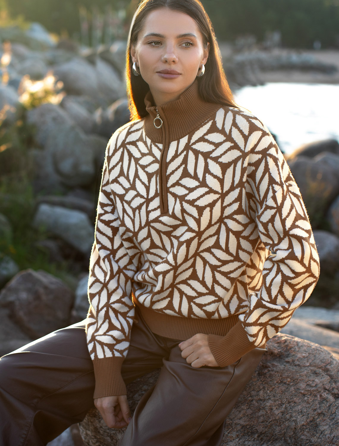 Джемпер с воротом на молнии двуслойной жаккардовой вязки выполнен из нежной пряжи на основе вискозы с добавлением кашемира. Мягкая модель с золотистой фурнитурой не раздражает кожу, приятно ощущается на теле и поддерживает комфортный микроклимат. Совет стилиста: такой джемпер может стать ключевым акцентом в сдержанном комплекте. Выбирайте однотонные низы в тон рибаны или на контрасте. карамельный-бежевый