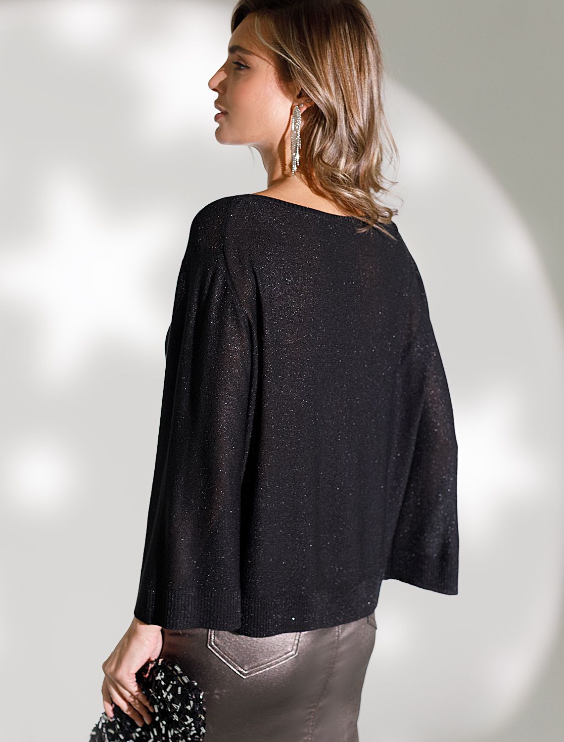 Свободный джемпер тонкой вязки сочетает мягкость вискозы с изысканным блеском люрекса. Легкий и нарядный, он идеально подходит для повседневных и праздничных образов. Расклешенные широкие рукава придают изделию стильный и необычный силуэт, а серебристый блестящий эффект добавляет сияния и подчеркивает красоту джемпера. Модель отличается комфортом благодаря свободному крою, который не сковывает движений и дарит ощущение легкости на теле и подходит для больших размеров, обеспечивая комфортную посадку на фигуре. Полотно сохраняет форму даже после многократных стирок, не теряя эластичности и эстетики.