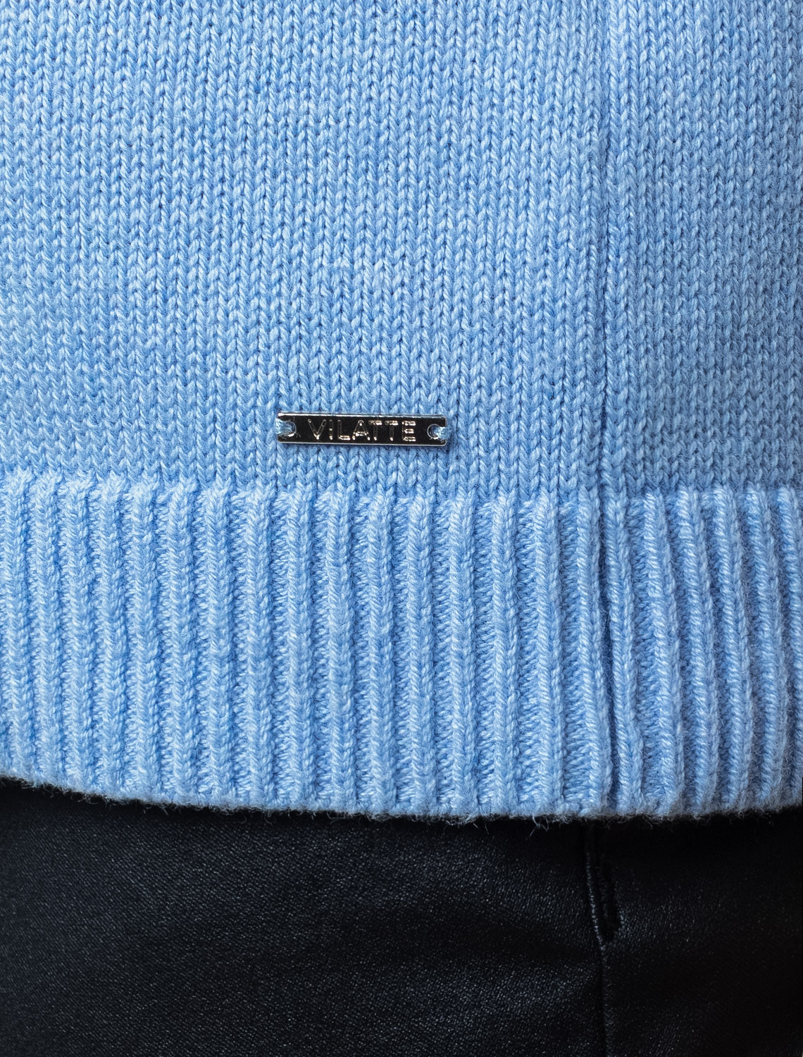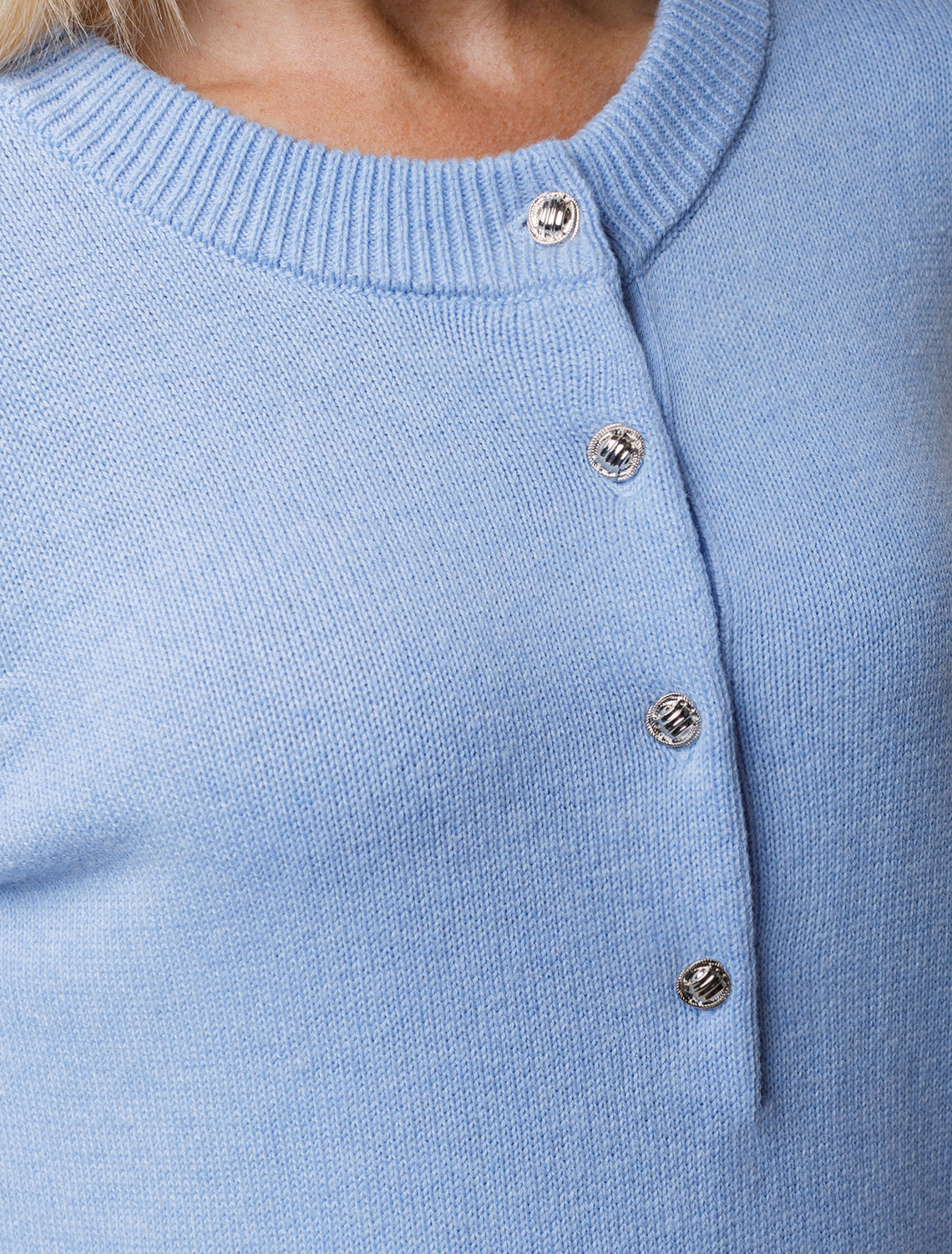 Джемпер тонкой вязки выполнен из хлопка с добавлением кашемира. Модель с круглым вырезом дополнена золотистыми пуговицами. Мягкая и очень приятная пряжа совершенно не колется, сохраняет тепло при этом не перегревая, гарантируя безупречный комфорт. голубой меланж
