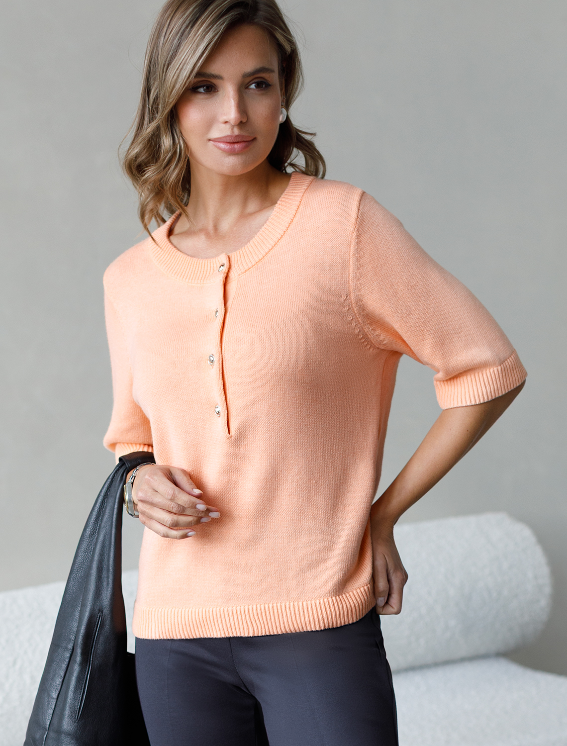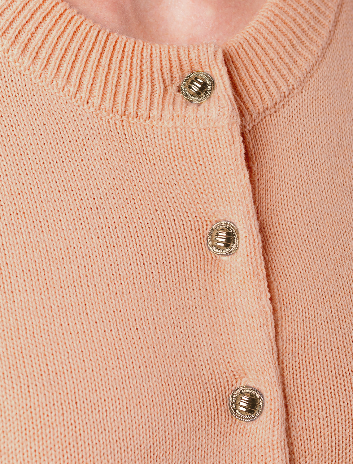 Джемпер тонкой вязки выполнен из хлопка с добавлением кашемира. Модель с круглым вырезом дополнена золотистыми пуговицами. Мягкая и очень приятная пряжа совершенно не колется, сохраняет тепло при этом не перегревая, гарантируя безупречный комфорт. персиковый