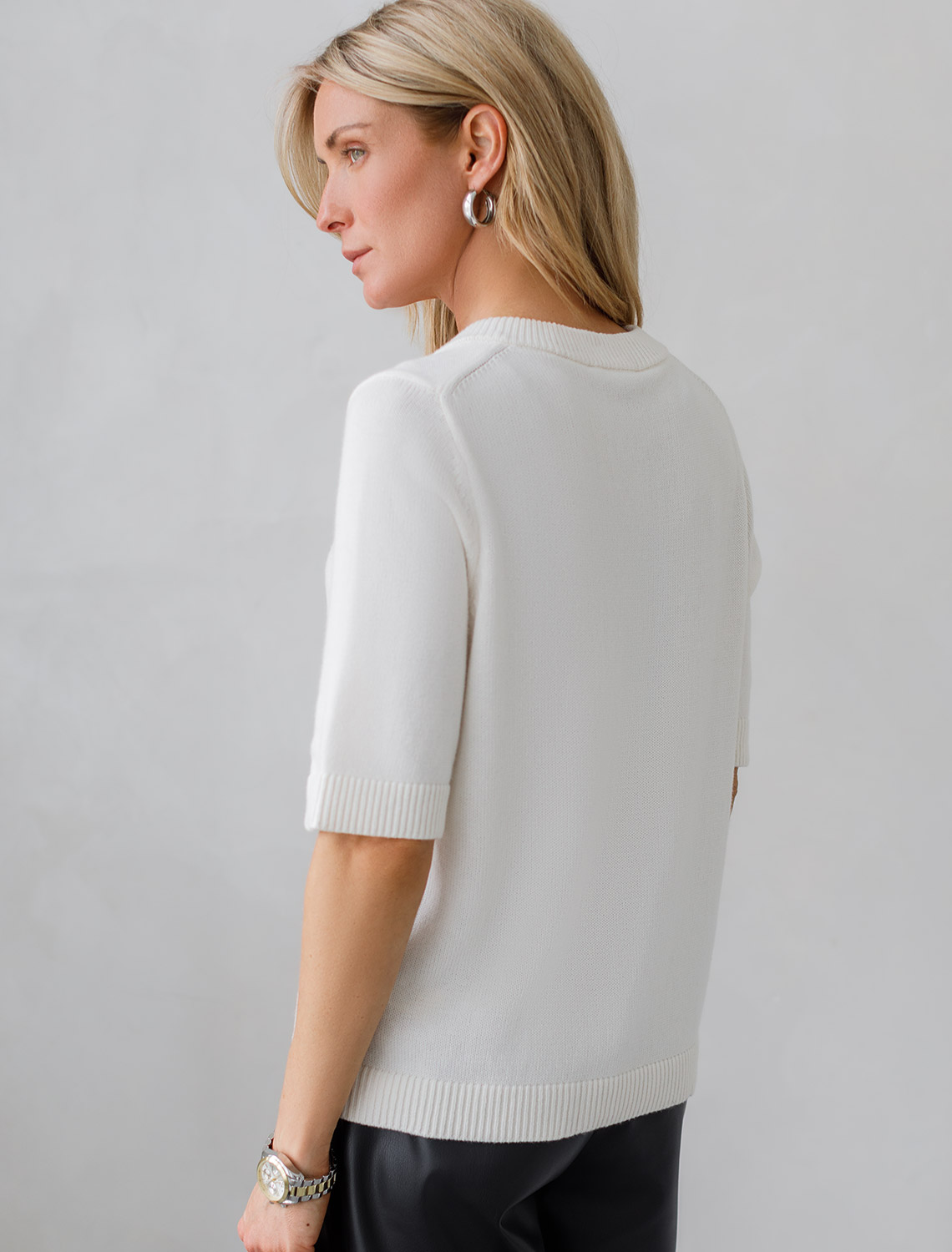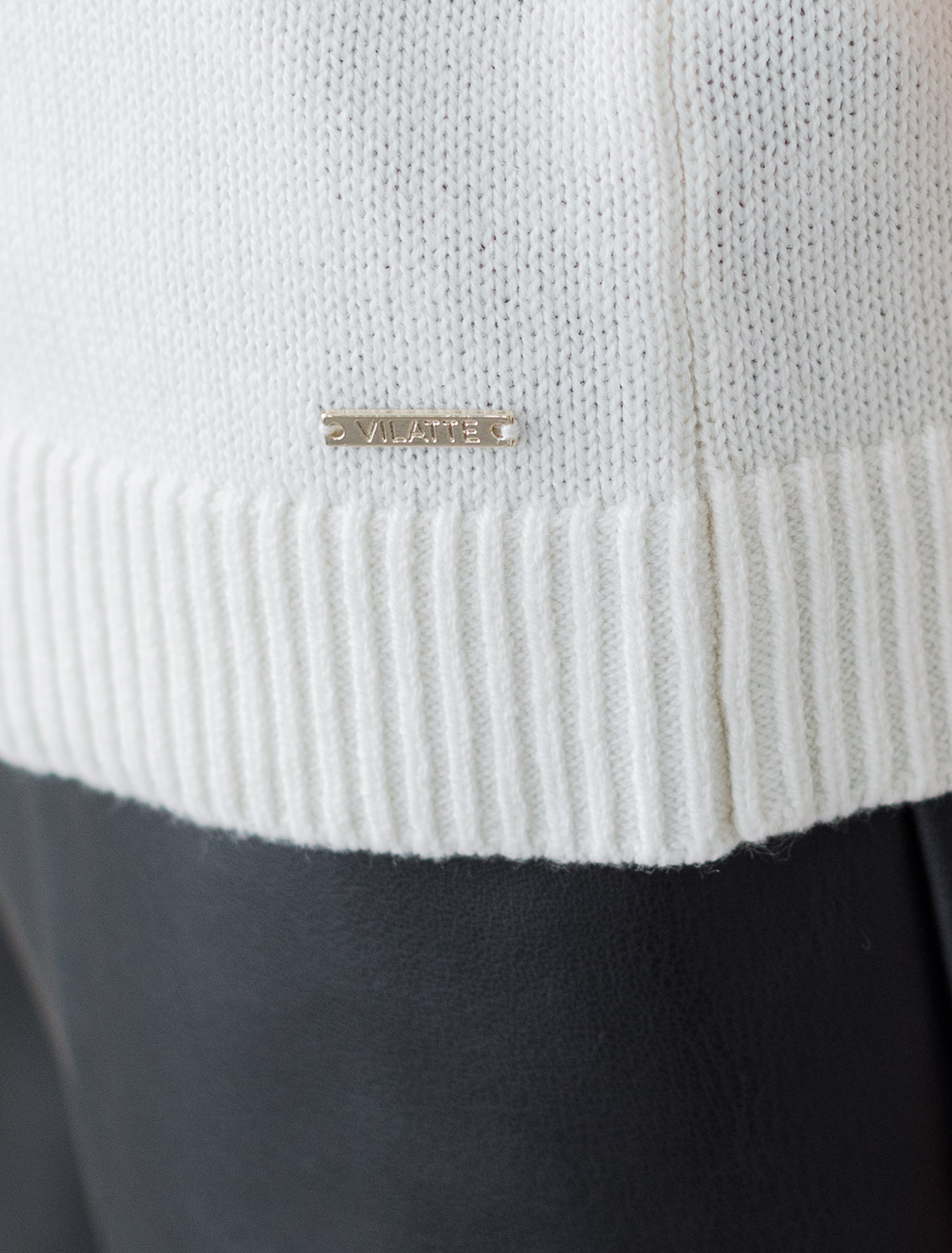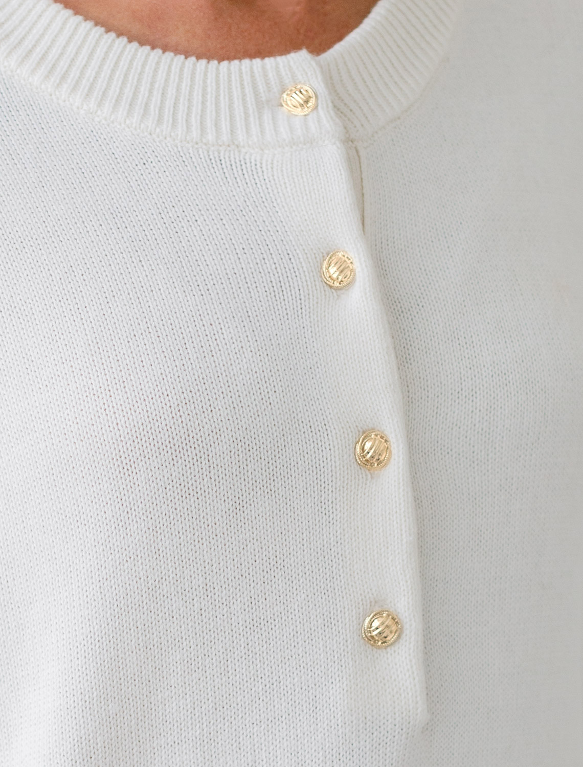 Джемпер тонкой вязки выполнен из хлопка с добавлением кашемира. Модель с круглым вырезом дополнена золотистыми пуговицами. Мягкая и очень приятная пряжа совершенно не колется, сохраняет тепло при этом не перегревая, гарантируя безупречный комфорт. натуральный белый