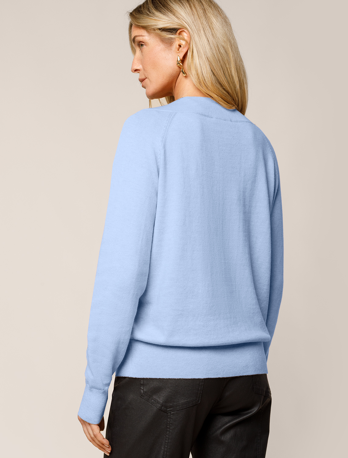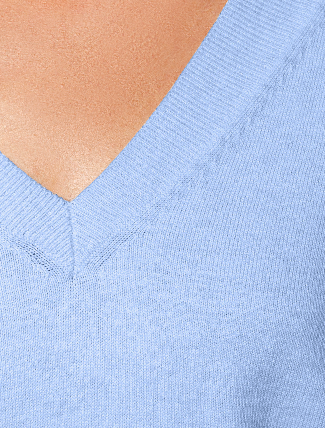 Джемпер тонкой вязки выполнен из хлопка с добавлением кашемира. Модель с V-вырезом свободного силуэта. Мягкая и очень приятная пряжа в рубчик совершенно не колется, сохраняет тепло при этом не перегревая, гарантируя безупречный комфорт. голубой меланж