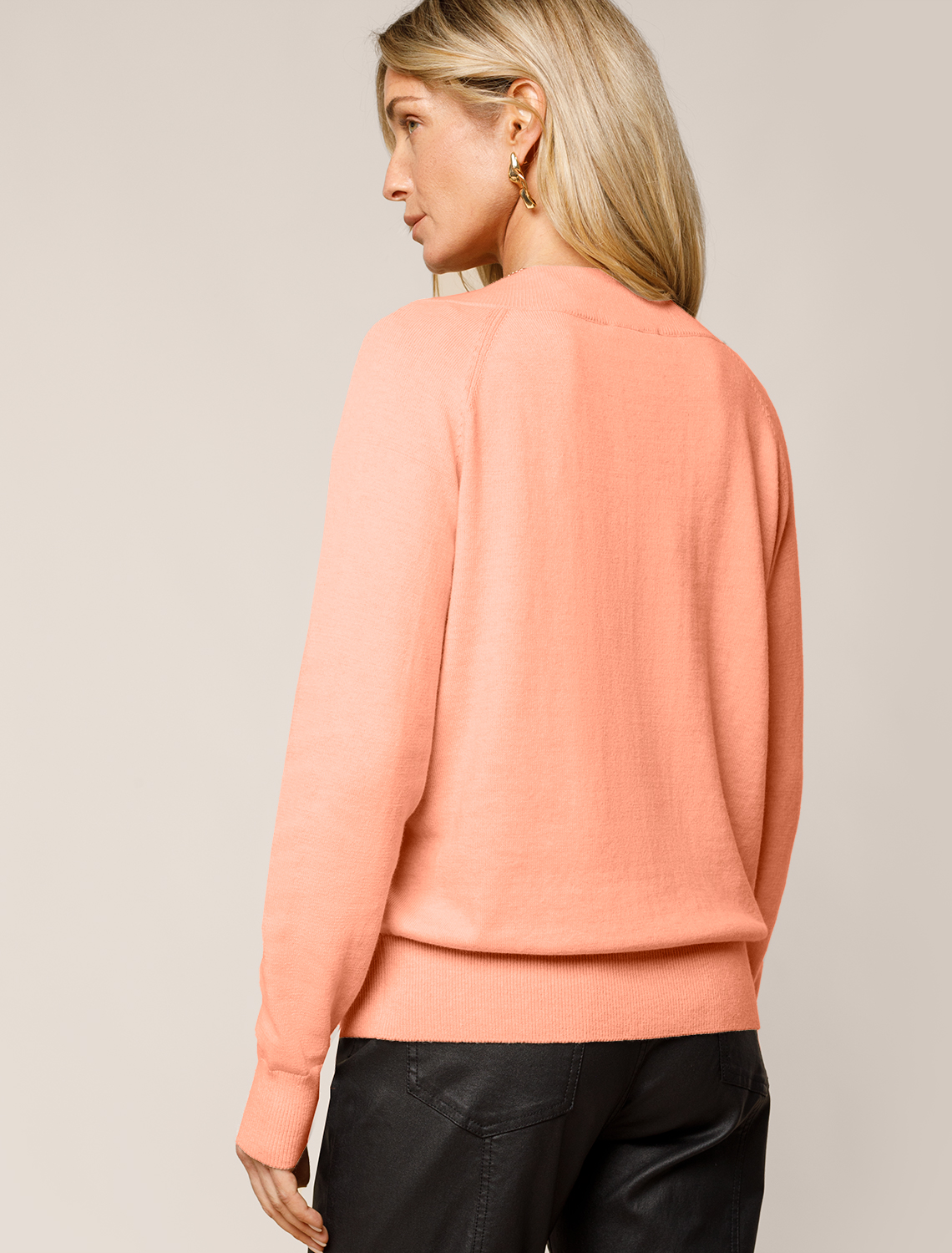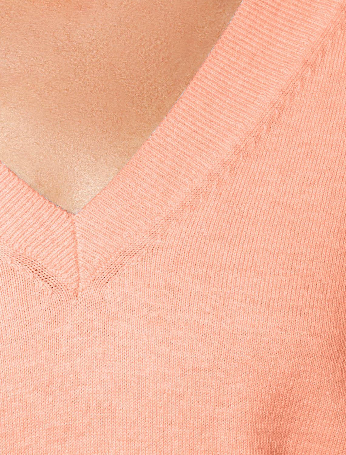 Джемпер тонкой вязки выполнен из хлопка с добавлением кашемира. Модель с V-вырезом свободного силуэта. Мягкая и очень приятная пряжа в рубчик совершенно не колется, сохраняет тепло при этом не перегревая, гарантируя безупречный комфорт. персиковый