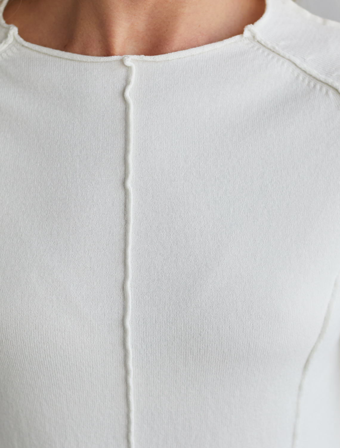 Джемпер тонкой вязки выполнен из мягкой хлопковой пряжи. Модель с декоративными швами идеально сидит по фигуре подчеркиваяч изгибы тела. Подходит для любой фигуры и впишется в любой гардероб. Изделие дополнено металлическим логотипом бренда. натуральный белый