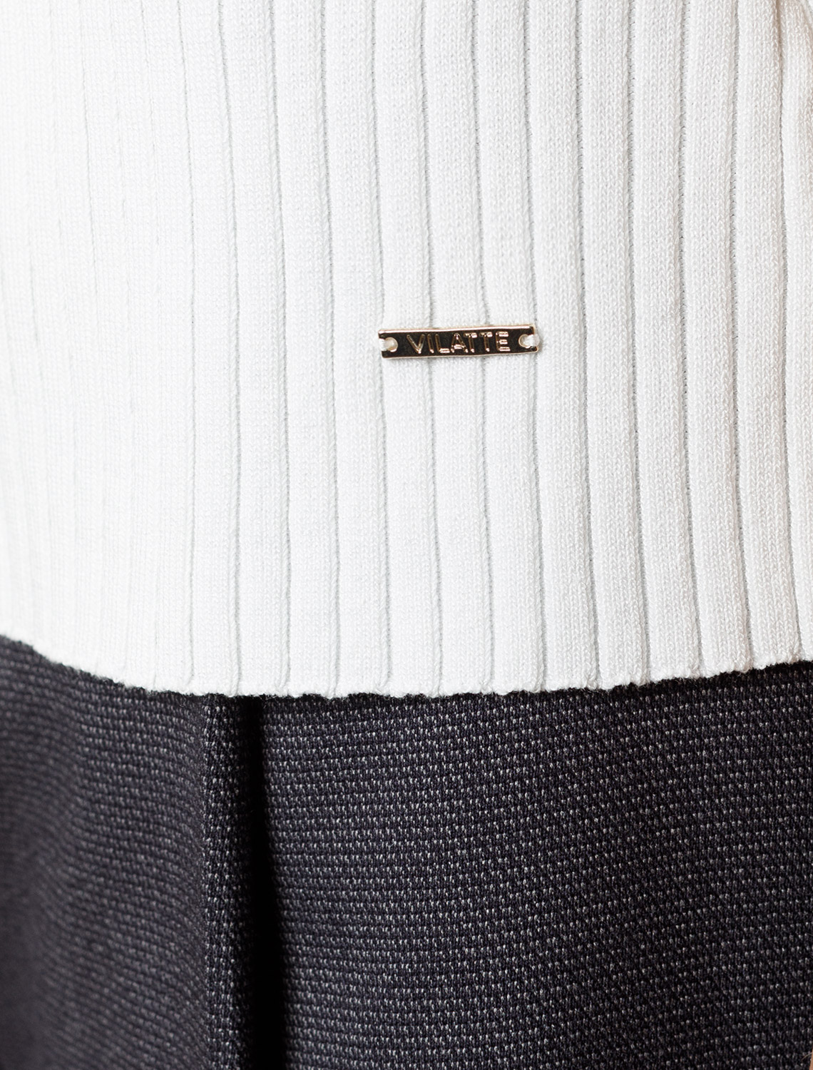 Джемпер тонкой вязки из вискозы с нейлоном. Модель с V- вырезом прилегающего силуэта дополнена золотистыми пуговицами. Мягкая очень приятная к коже пряжа хорошо держит форму и гарантирует комфорт во время носки в течение всего дня. Изделие дополнено фирменным металлическим логотипом бренда. натуральный белый