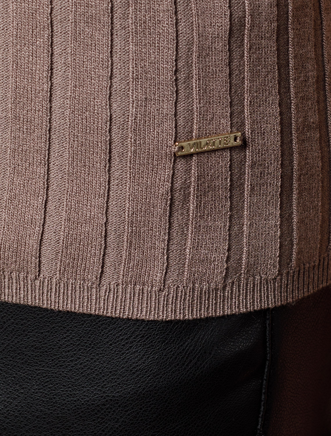 Джемпер тонкой вязки из вискозы с нейлоном. Модель с круглым вырезом прилегающего силуэта. Мягкая очень приятная к коже пряжа хорошо держит форму и гарантирует комфорт во время носки в течение всего дня. Изделие дополнено фирменным металлическим логотипом бренда. кофейный