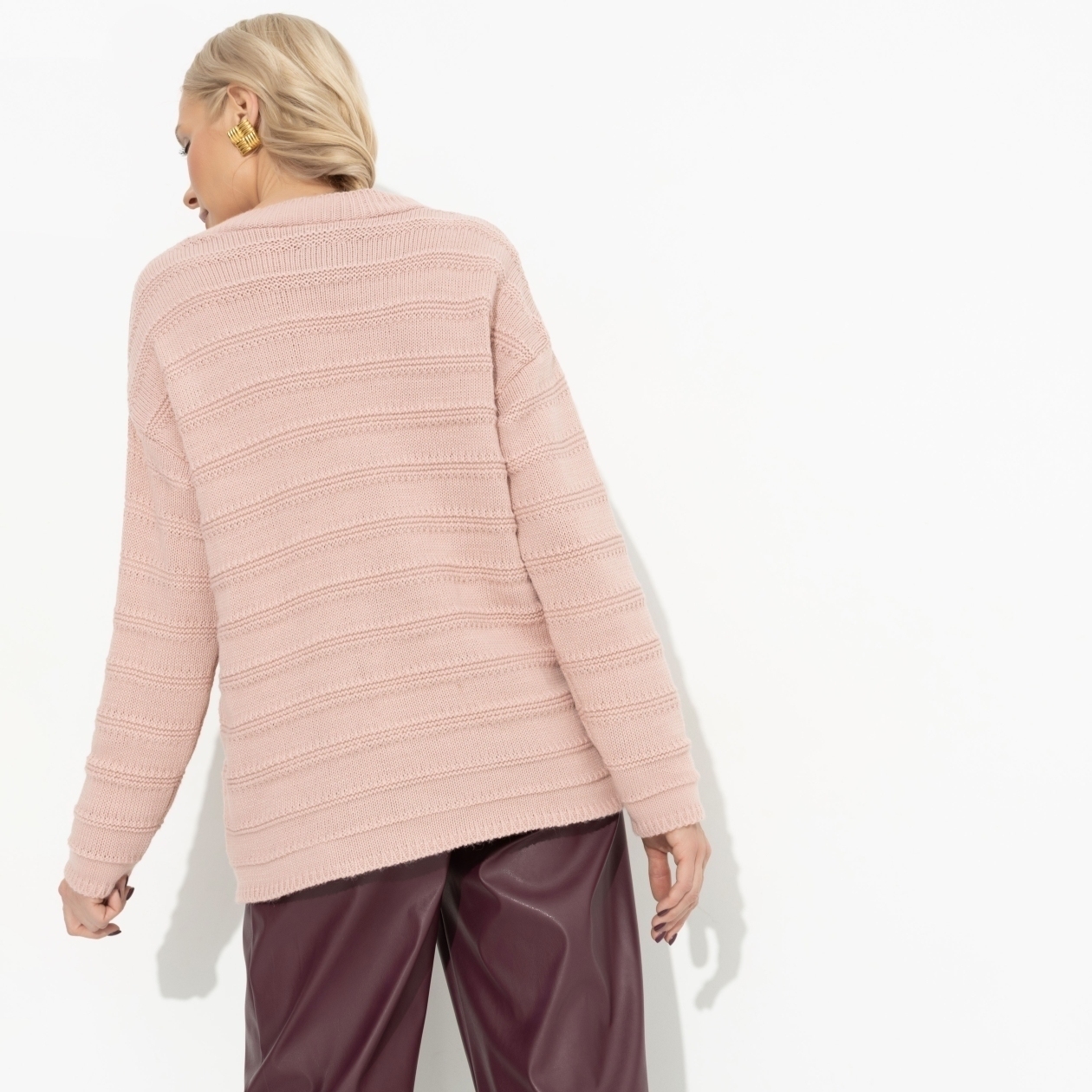 Возьмите курс на нежность. С любовью сделайте завтрак, аккуратно намазав булочки джемом, ласково разбудите семью и с улыбкой помогите всем собраться. Завершающий штрих – джемпер в цвете сливочно-малинового десерта. Джемпер свободного кроя. Линия плеча спущена. Изделие удлинено. Текстурная вязка.