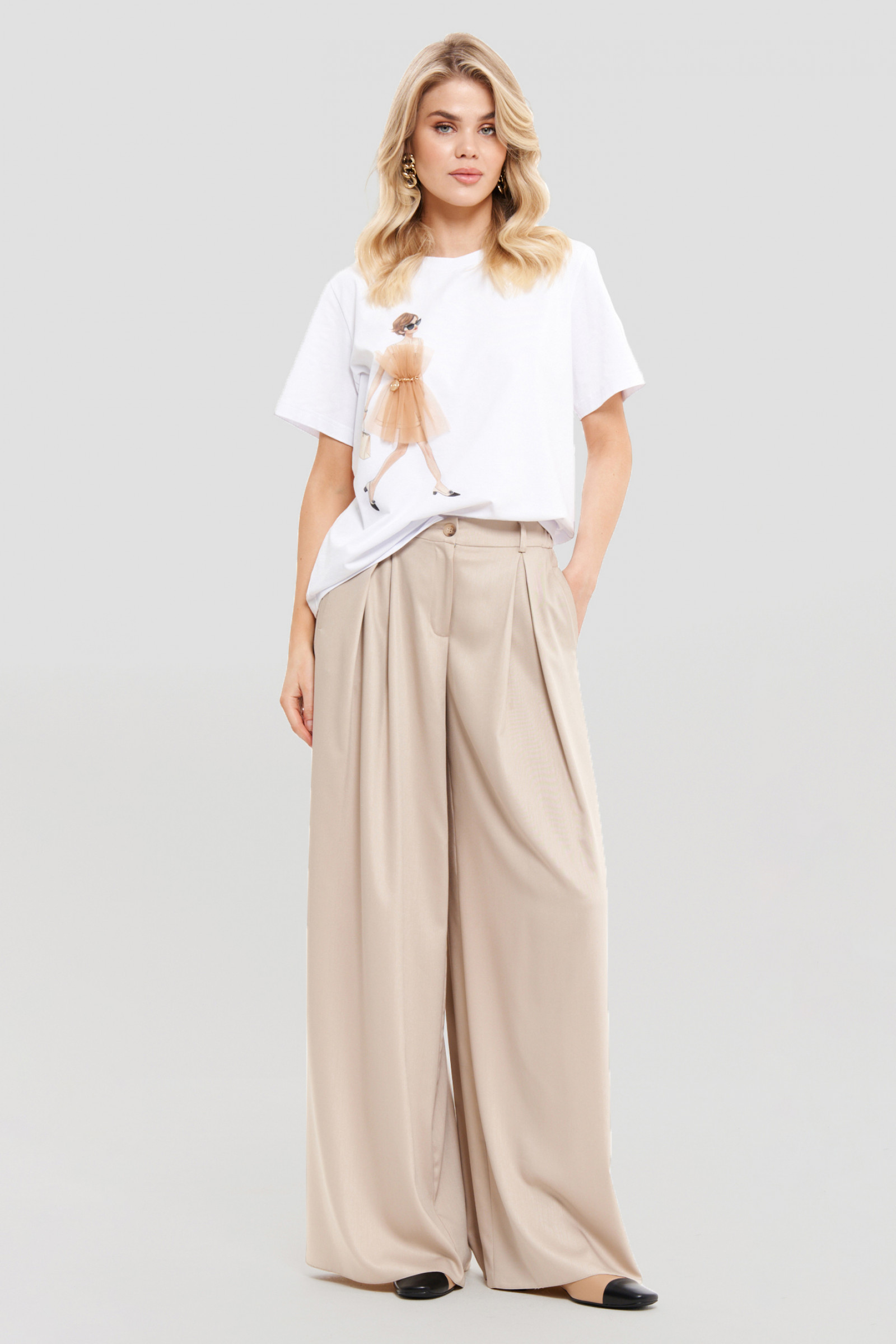 Особую привлекательность модели придает дизайнерская аппликация на передней части — изображение изысканной девушки в нарядном платье из фатина с поясом в виде цепочки и стильной эмблемой. Этот нарядный элемент украшает джемпер и выделяет его среди других повседневных вещей. Расширенная горловина и рукава на уровне локтя добавляют образу легкости и элегантности. Женский джемпер отлично подойдет тем, кто ценит стиль, комфорт и оригинальные детали в одежде.