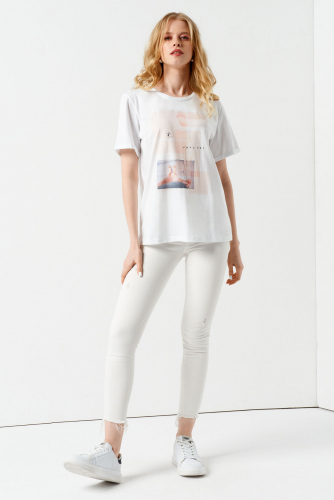 Летний джемпер с коротким рукавом подарит вам комфорт и свободу движений. Его можно сочетать с джинсами, брюками, шортами, джинсовыми юбками, составлять модные образы для прогулок, вечеринок с друзьями и отдыха. Женская футболка украшена принтом, что придает однотонному изделию ноту пикантности. Натуральный хлопок, из которого изготовлен легкий джемпер, дарит приятные ощущения – не парит и не холодит. Даже в жаркую погоды, летняя женская футболка подарит вам исключительный комфорт.