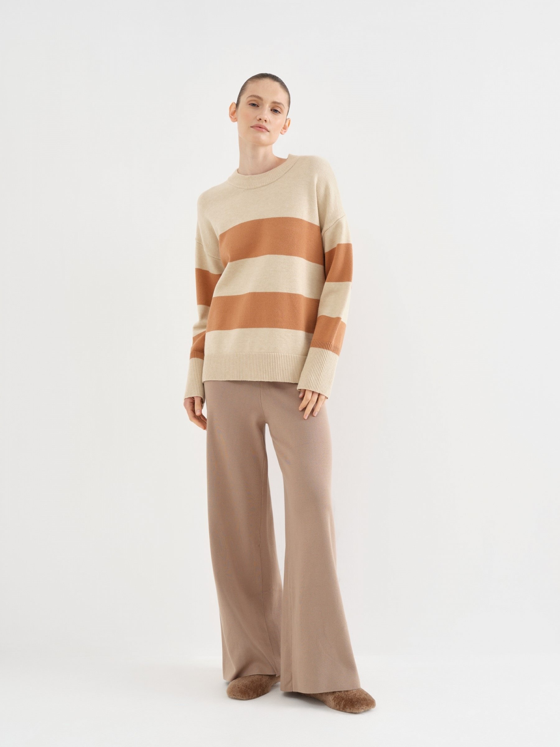 Акцентный джемпер в классическом исполнении – прямого свободного кроя и с аккуратной круглой горловиной. Отличный компаньон для деловых и casual-луков. Оформлен трендовыми широкими полосами, которые чередуются на основной части и рукавах, что придает дизайну динамику. Принт начинается от зоны груди, визуально облегчая верх. Еще отметим мягкий теплый трикотаж на основе вискозы, который подарит уют и респектабельный вид.