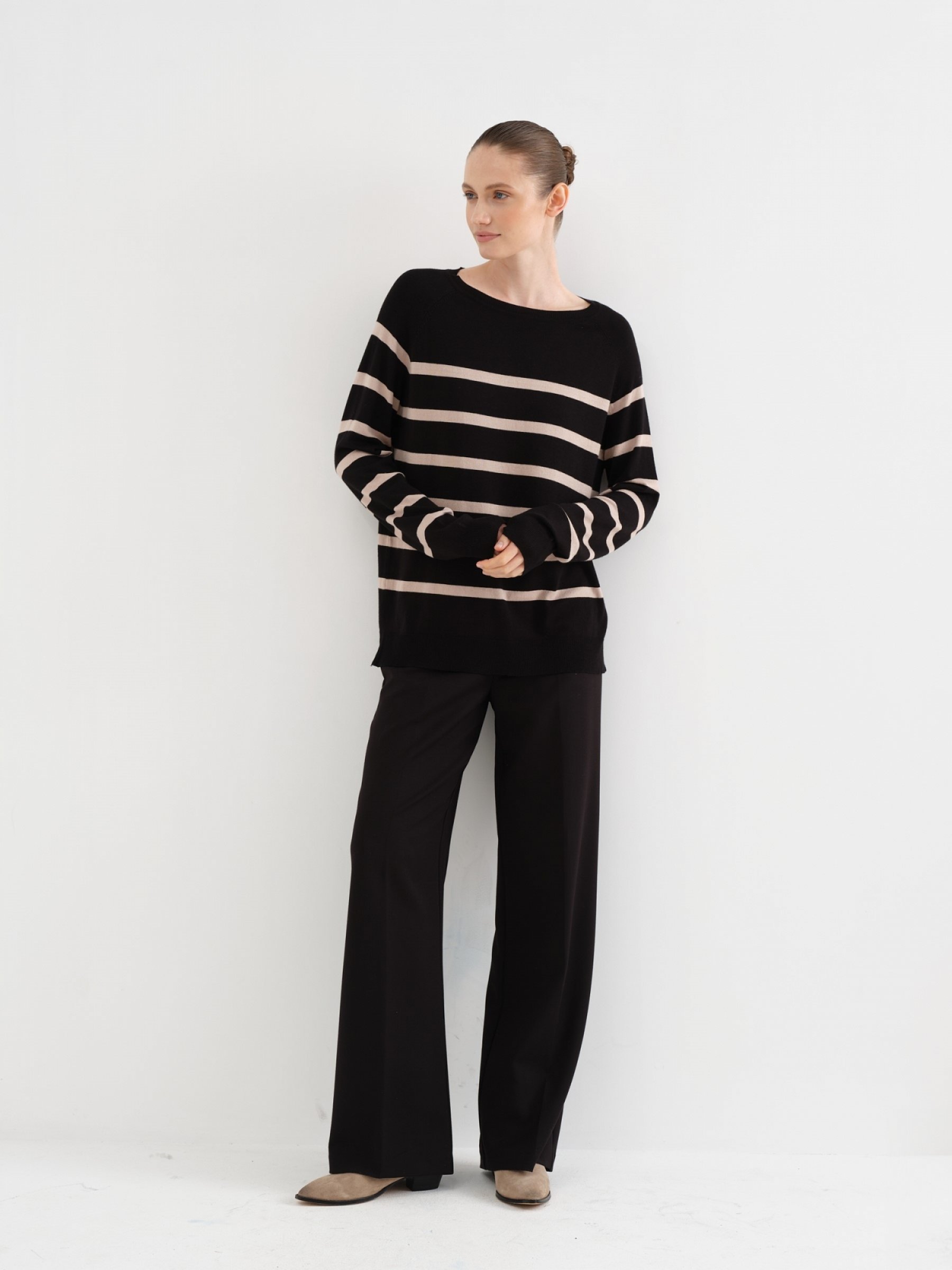 Джемпер в трендовую контрастную полоску выручит, когда вам нужен элегантный и при этом динамичный акцент. Например, в деловом комплекте. Низ в цвете основы или полос джемпера станет идеальной парой. Выполнили модель гладкой вязкой из мягкого смесового полотна на основе вискозы с добавлением нейлона. Это комбо делает джемпер эластичным, прочным и удобным в уходе. Идеальный комфортный компаньон на каждый день.