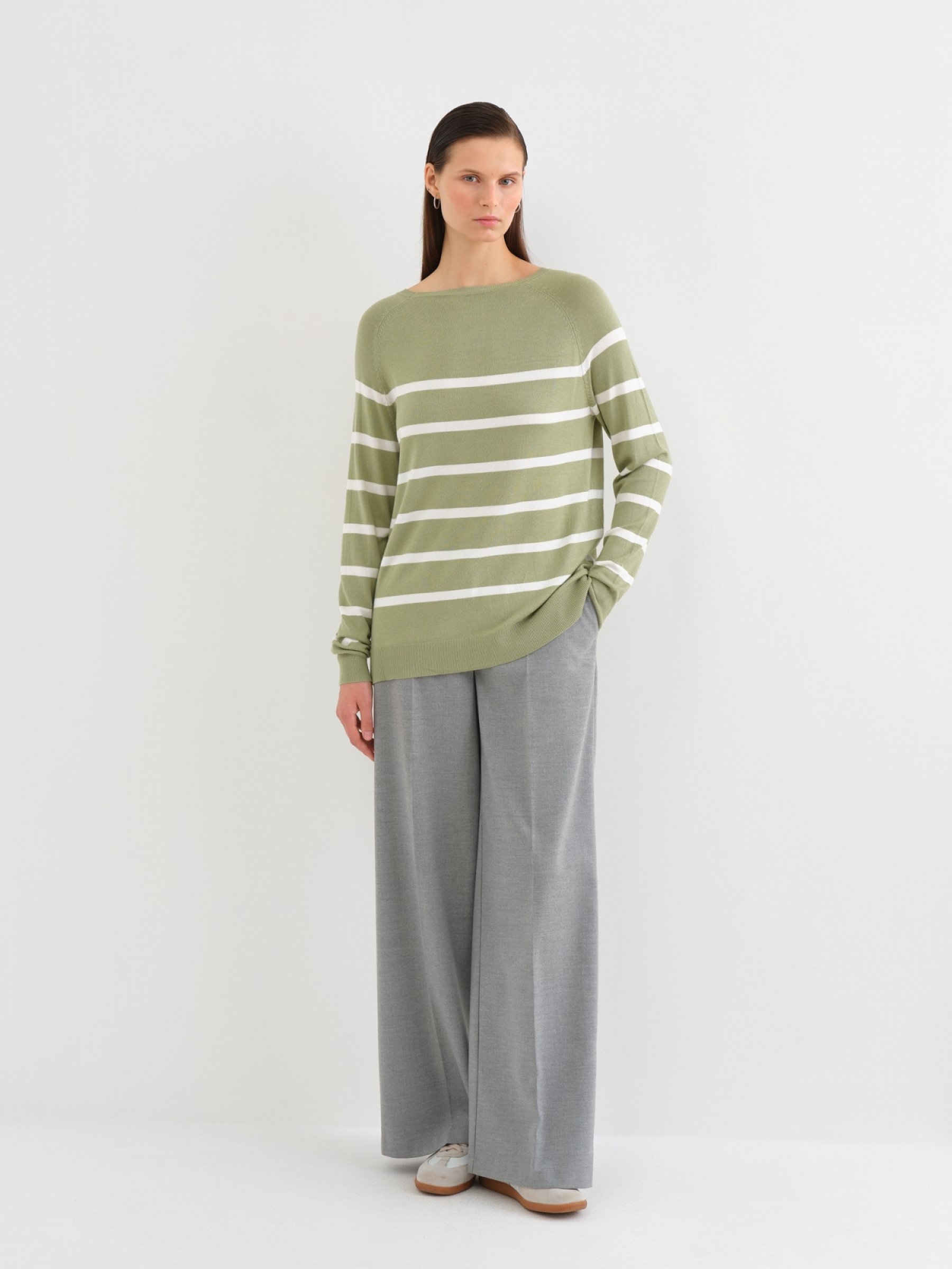 Джемпер в трендовую контрастную полоску выручит, когда вам нужен элегантный и при этом динамичный акцент. Например, в деловом комплекте. Низ в цвете основы или полос джемпера станет идеальной парой. Выполнили модель гладкой вязкой из мягкого смесового полотна на основе вискозы с добавлением нейлона. Это комбо делает джемпер эластичным, прочным и удобным в уходе. Идеальный комфортный компаньон на каждый день.