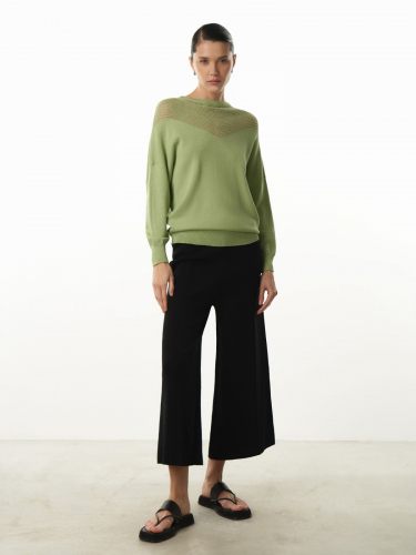 Оригинальный джемпер контрастной фактурной вязки придаст образу утонченную воздушность. Выполнен из качественного трикотажа на основе вискозы. Джемпер имеет комфортный объемный крой,спущенную линию плеча, рукава “летучая мышь” с прилегающими манжетами -резинкой. Особый шарм изделию придает ажурная вязка в верхней части, красиво подчеркивающая плечи. По низу – широкая резинка в тон. Модель выполнена в базовых цветах: сером, бежевом и зеленом.
