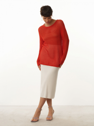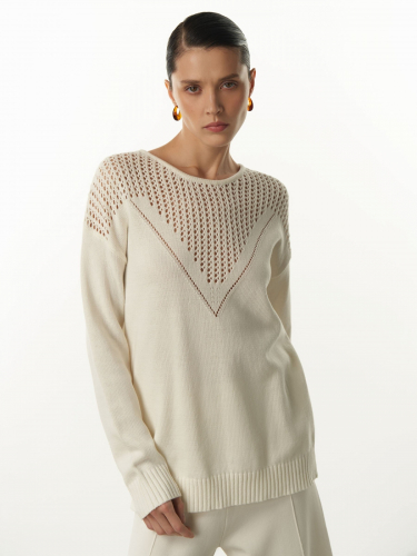 Этот элегантный джемпер фактурной комбинированной вязки выделяет красивое сочитание глаткого и ажурного трикотажного полотна. Тонкая ажурная вязка дает акцент на плечи и линию декольте. Удлиненная модель свободного кроя со спущенной линией плеч и зауженными рукавами полной длины. Круглая горловина оформлена обтачкой, манжеты и низ – фактурной резинкой. Джемпер изготовлен из ультрамягкого трикотажа, приятен телу и прост в уходе. Монохромные универсальные цвета: серо-бежевый, джинсовый, молочный.