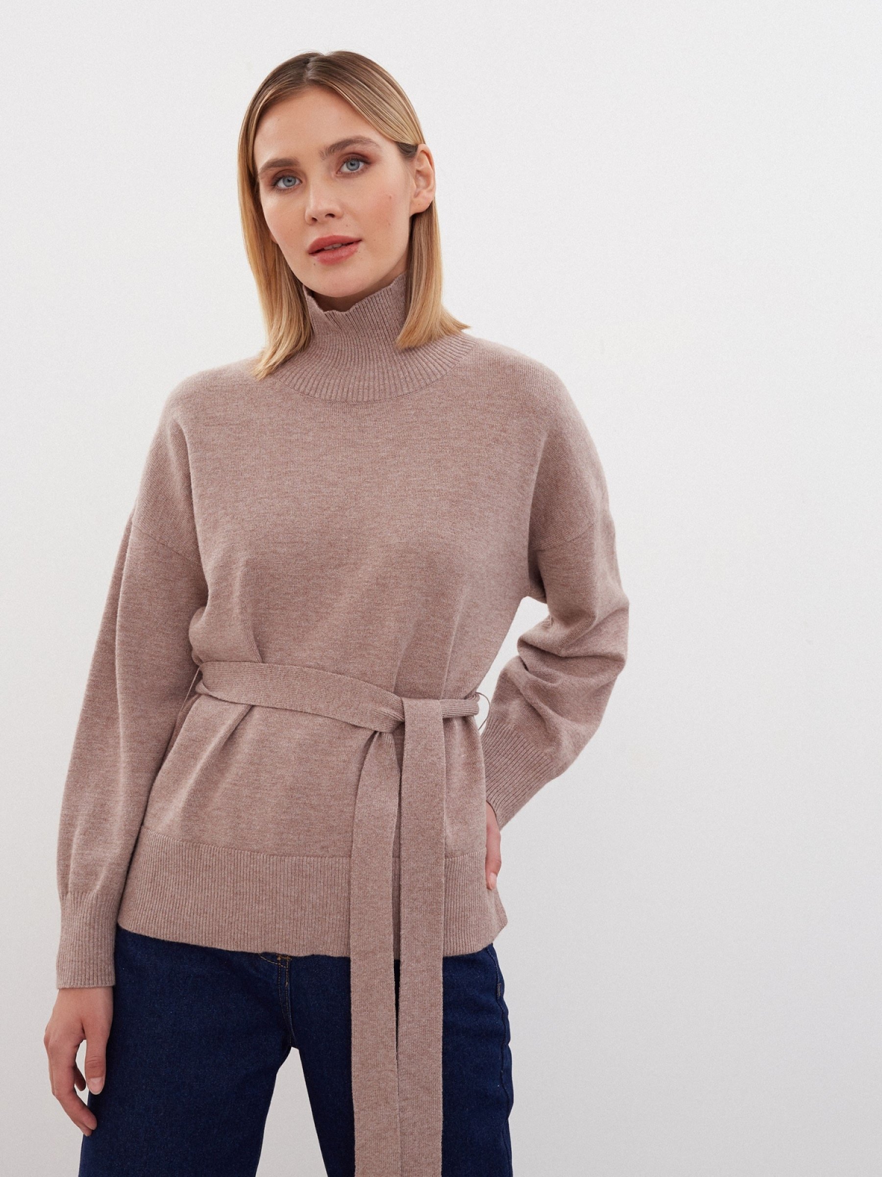 Трикотажный свободный джемпер гладкой вязки выполнен из приятной к телу пряжи из мягкой вискозы и нейлона и дополнен широкой резинкой в рубчик по манжетам и нижнему краю. Смесовая шерстяная ткань на основе вискозы – прочный, эластичный материал, сочетающий в себе лучшие свойства натуральных и синтетических волокон. Классический крой, обрамленный высоким воротом-стойкой. Широкий эластичный пояс в тон изделия, подчеркивающий талию. Гармоничная деталь, которую можно сочетать как с акцентным низом, например, кожанной юбкой миди, так и базовыми широкими брюками