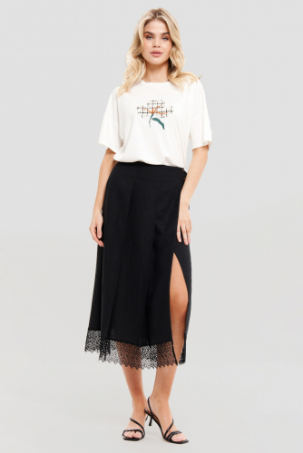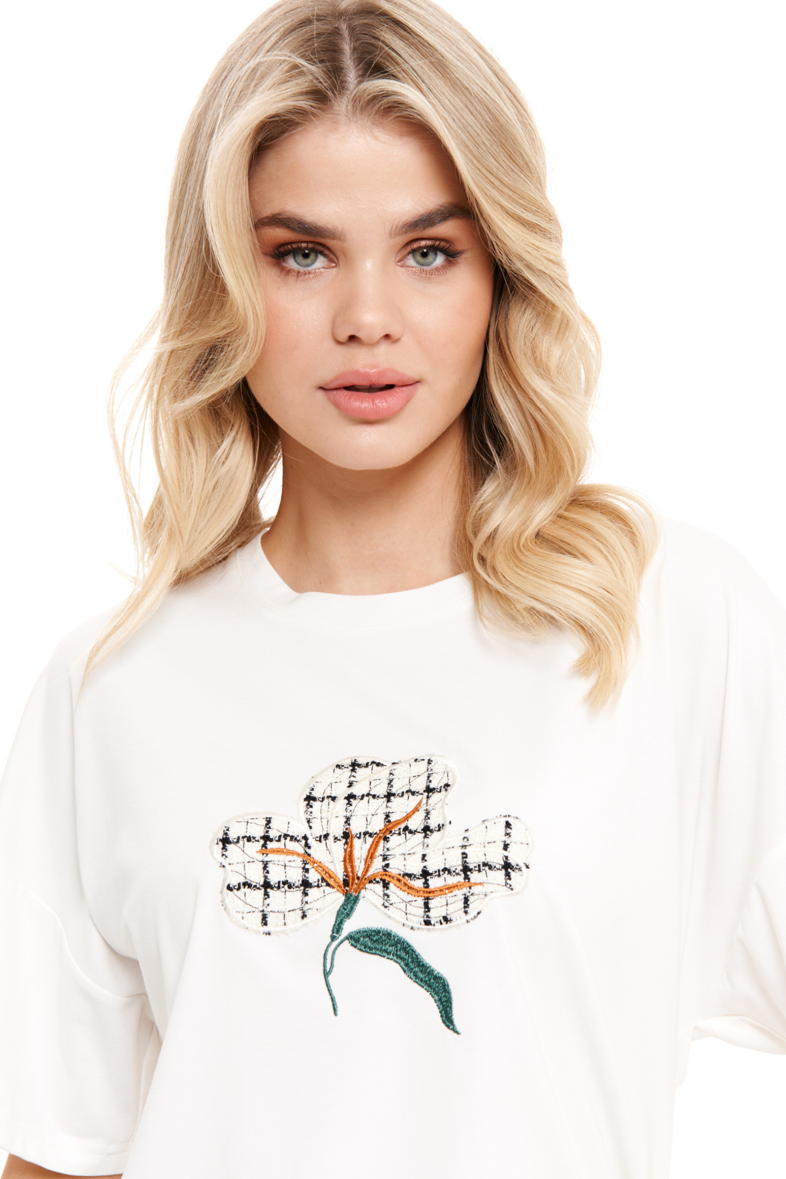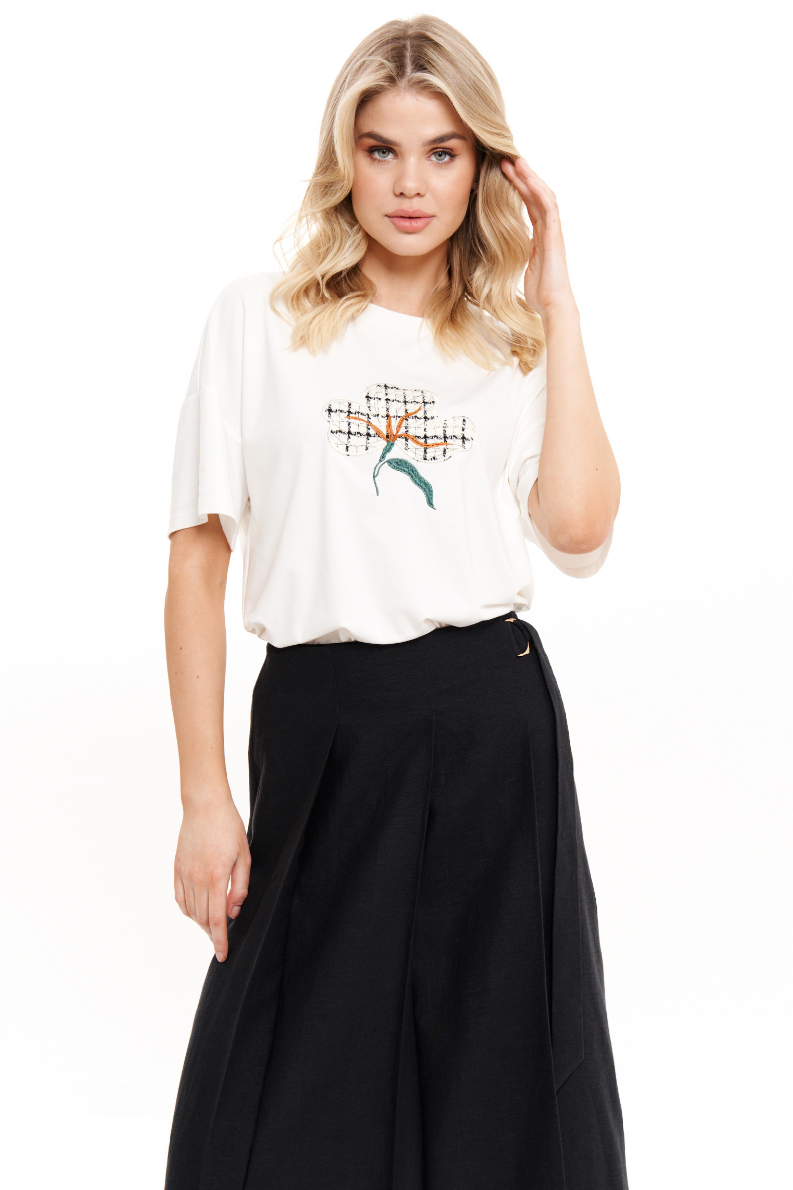 Женский джемпер из поливискозного трикотажного полотна – стильное и универсальное решение для повседневного гардероба. Благодаря продуманному крою и мягкой текстуре материала он идеально подходит как для офиса, так и для прогулок, создавая комфортный и элегантный образ. Свободный силуэт делает его отличным выбором для весенних и летних дней, а классический дизайн с изысканной вышивкой и твидовой вставкой придает нарядный вид. Джемпер имеет слегка расширенную горловину, спущенную линию плеча и рукава длиной чуть ниже локтя, что делает его стильным и практичным вариантом на каждый день.
