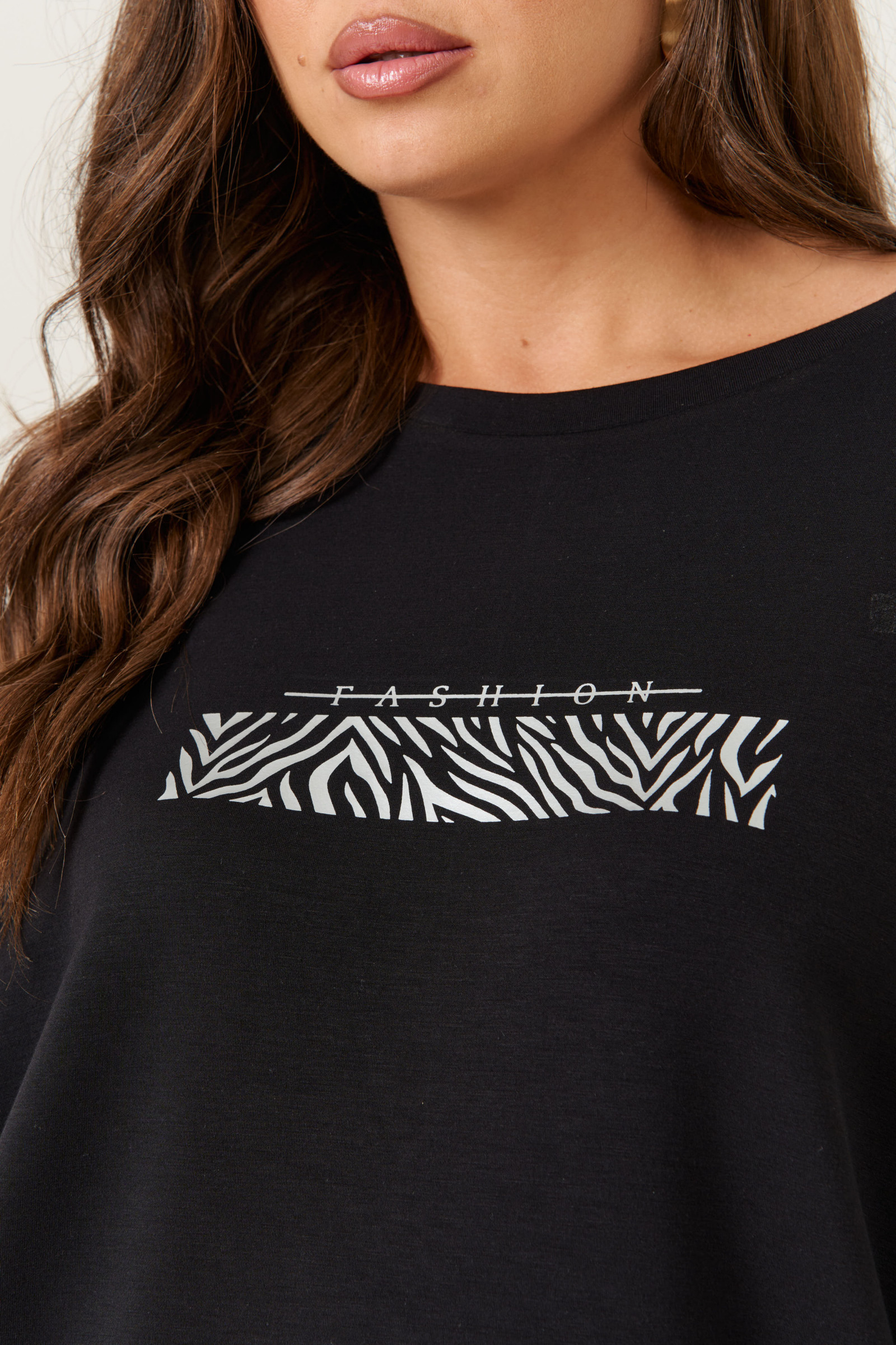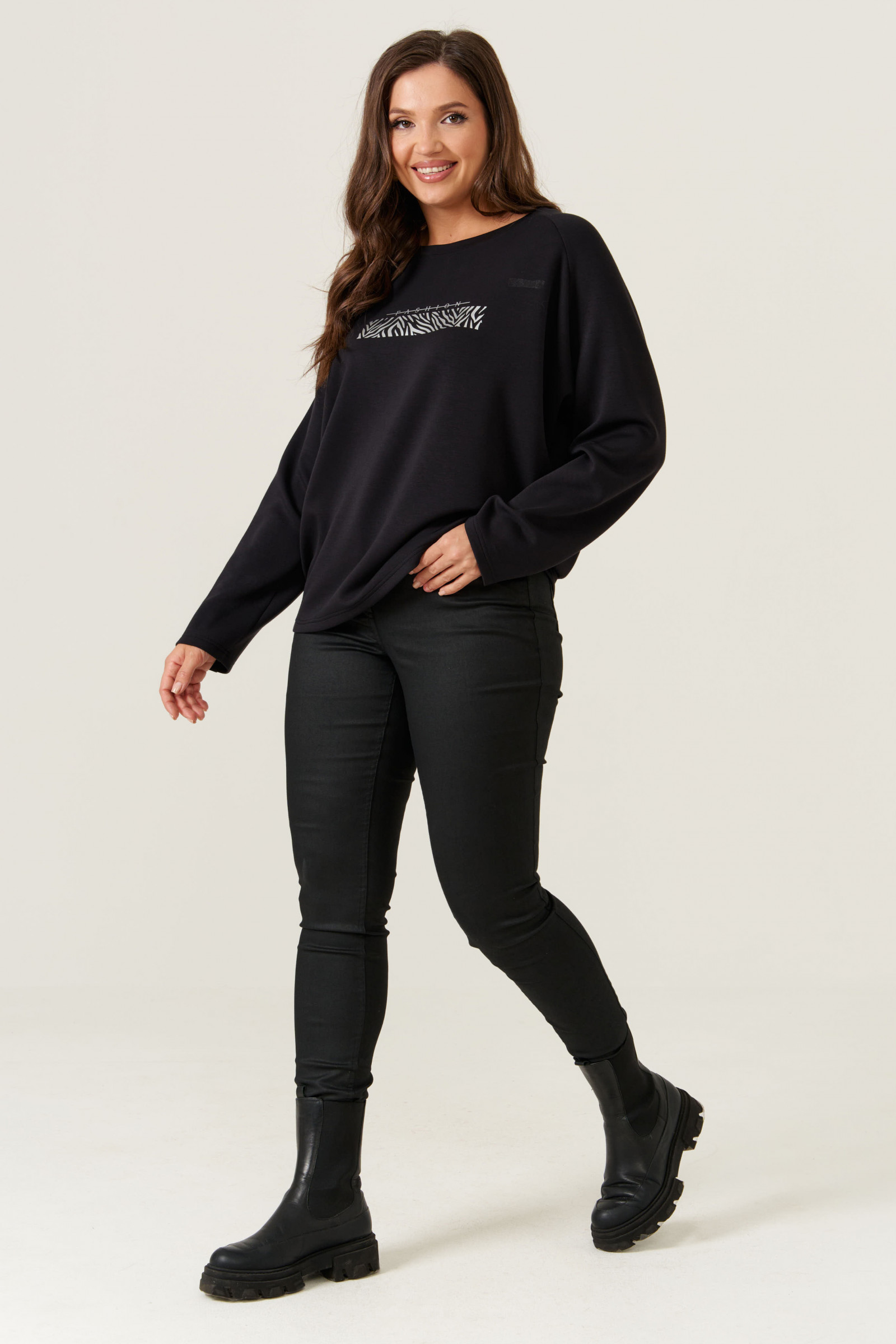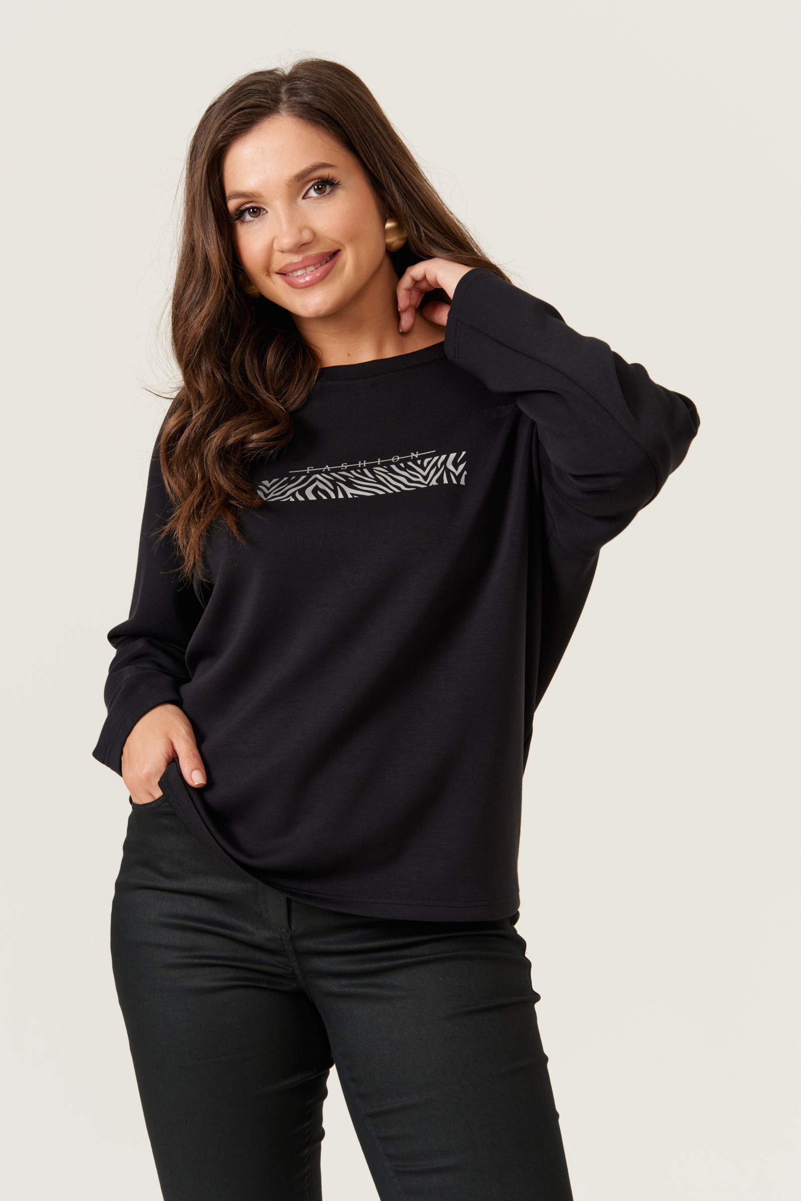 Этот женский джемпер выполнен из мягкого и приятного трикотажа, который обеспечивает комфорт в носке. Модель прямого силуэта подходит для разных типов фигуры и отлично сочетается с различными образами. Перед украшен дизайнерской печатью с интересным принтом и надписью, что придает изделию индивидуальность и стиль. Горловина чуть расширенная, обработана притачной тесьмой, что добавляет аккуратности и завершенности образу. Длинные рукава реглан обеспечивают свободу движений и комфорт. Классическая длина делает этот джемпер универсальным элементом гардероба. Чёрный оттенок легко сочетается с разными цветами и стилями, а его идеальная посадка подчеркнет вашу фигуру и привлечет восхищенные взгляды окружающих.