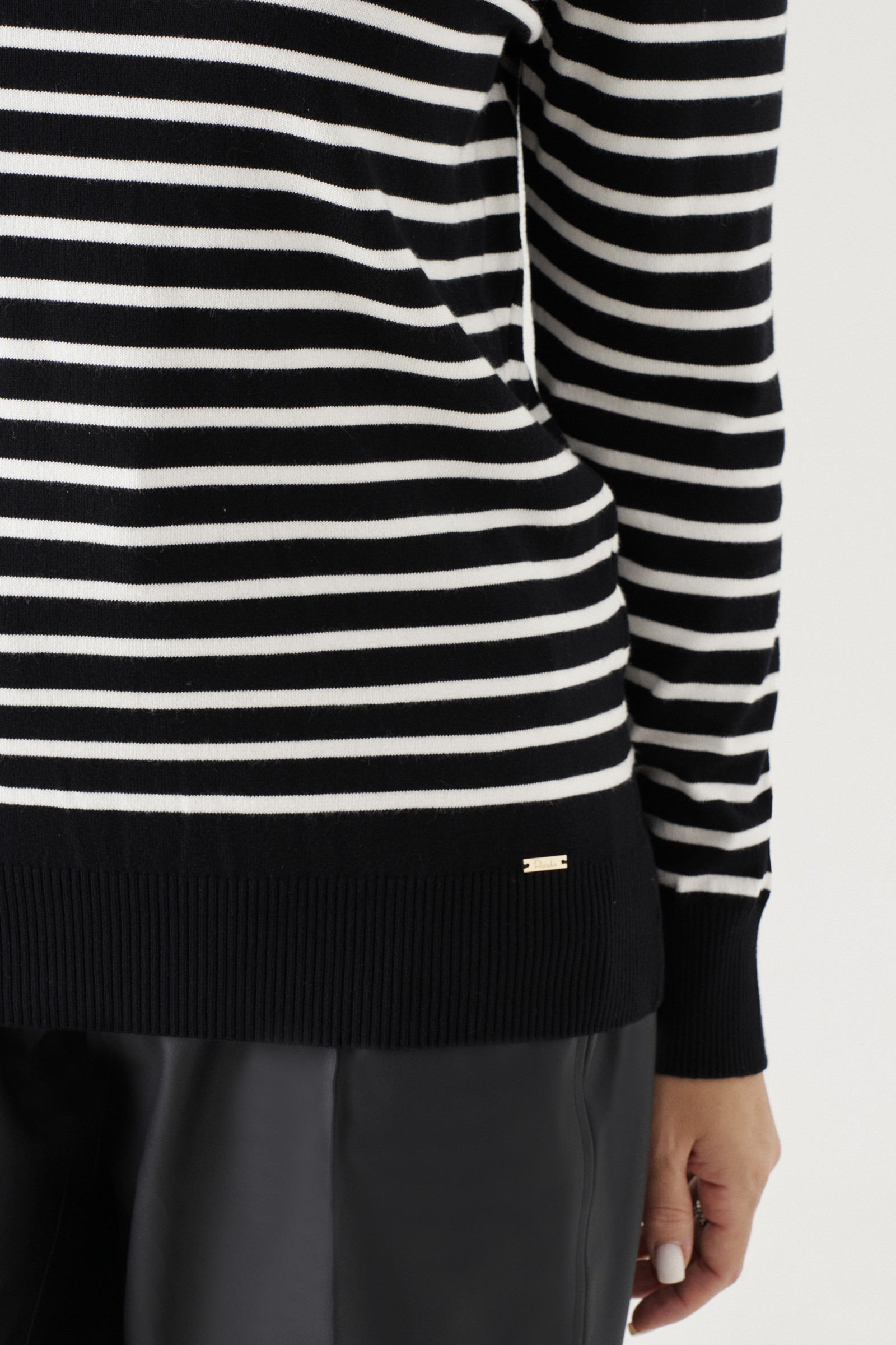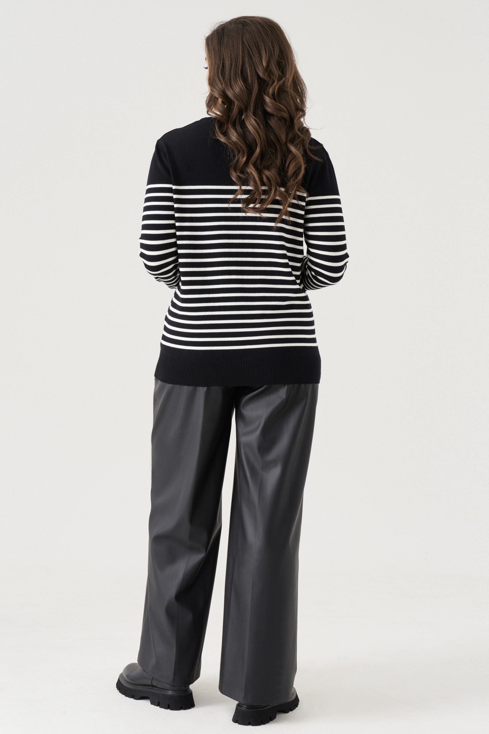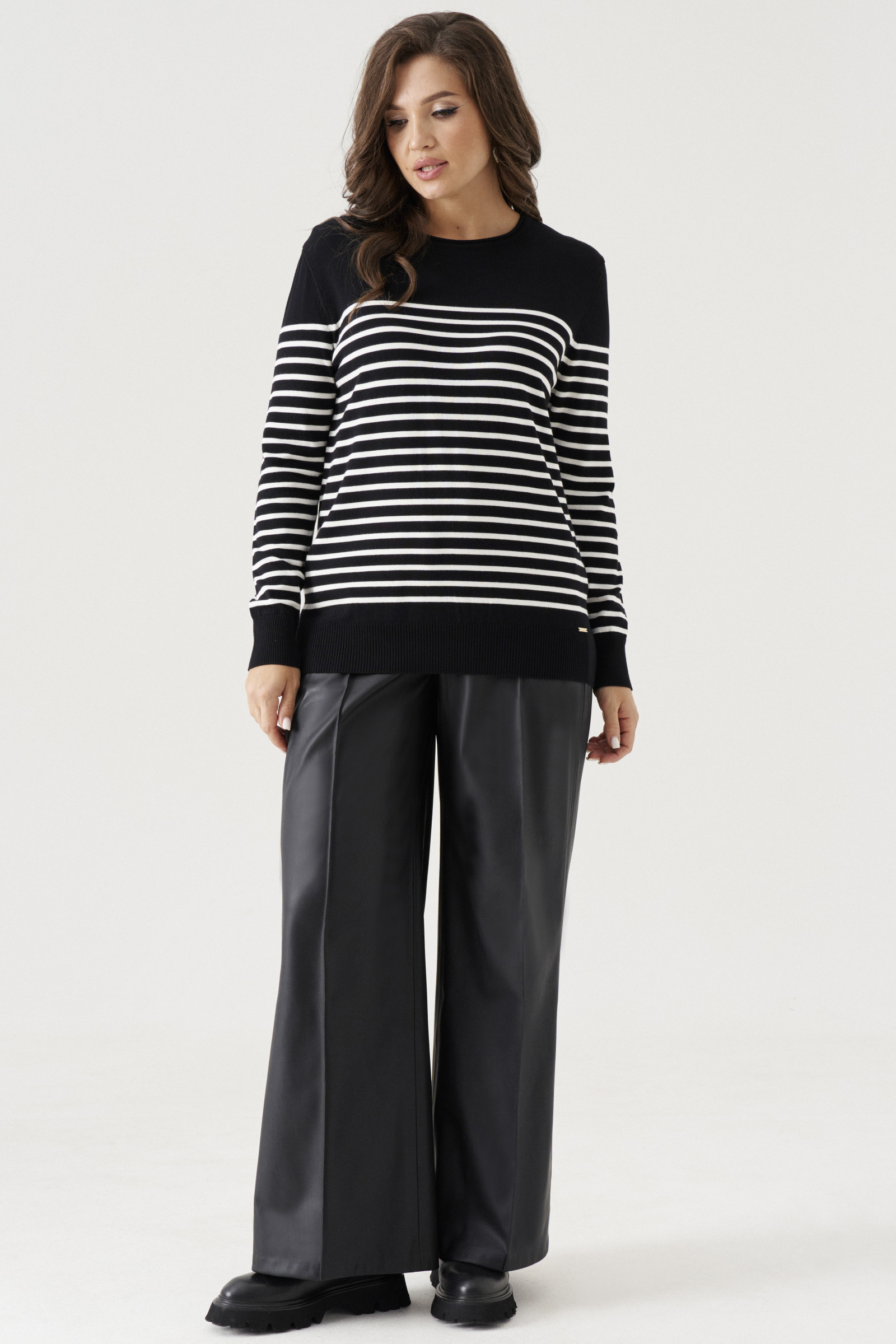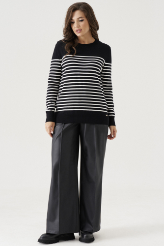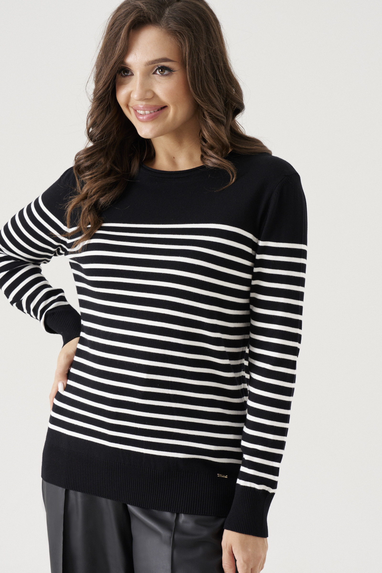 Джемпер женский из вискозной пряжи машинной вязки для повседневной носки. Джемпер прямого силуэта. По низу изделия и по низу рукава имеется довяз на резинке. Джемпер в двух монохромных цветах: черный в белую полоску и белый в чёрную полоску. Стильный и универсальный джемпер отличный вариант для вашего гардероба. В нем вы будете чувствовать себя комфортно, а главное большое содержание вискозы позволит вашей коже дышать.