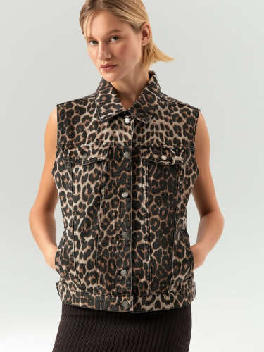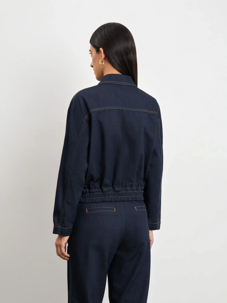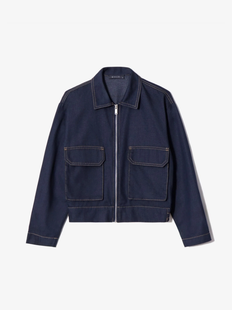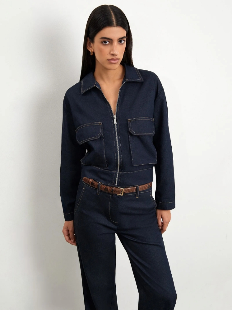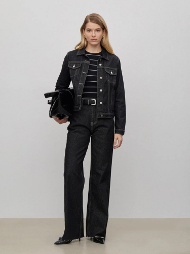 Плотная джинсовая куртка в тёмно-синем цвете отличается крупными карманами на груди и акцентной отстрочкой. Создаёт уверенный образ для повседневных дел. Завершить его можно джинсами из комплекта и трикотажным топом