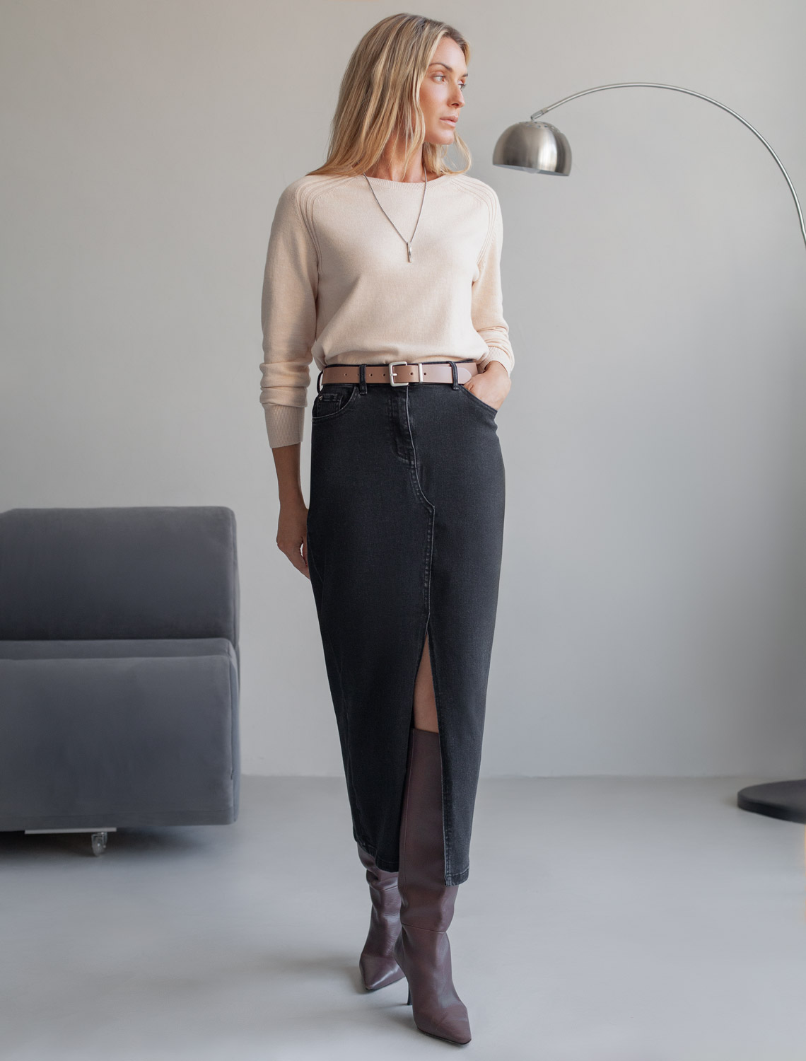 Удлиненная модель, прямого силуэта, с плотным прилеганием по бедрам. Высокий вырез спереди и классические джинсовые карманы спереди и сзади. черный