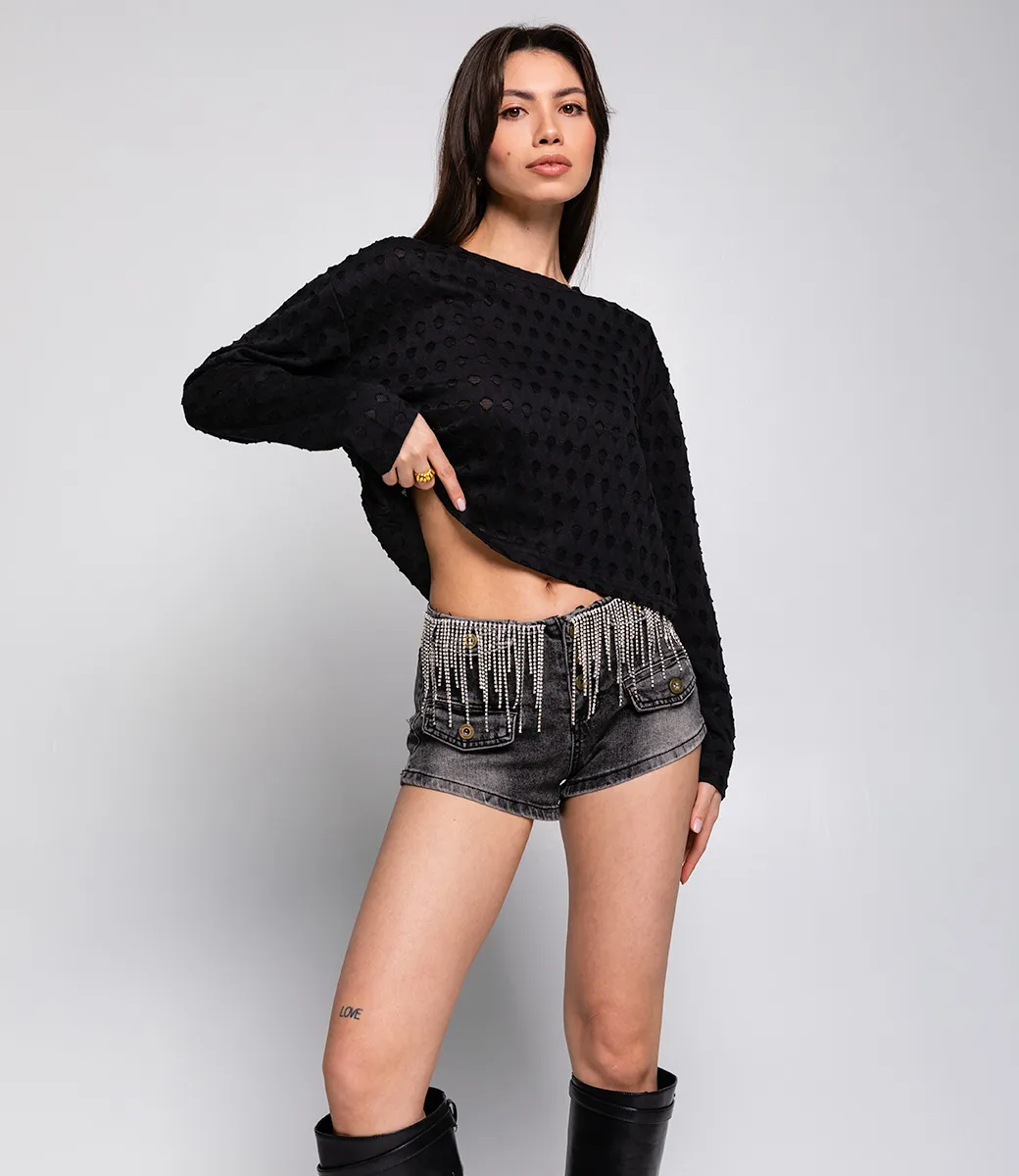 Джинсовые короткие шорты - это летний и стильный вариант нижней одежды. Они изготовлены из прочного и прочного денима, что позволяет им выдерживать нагрузки и сохранять свою форму даже при активном использовании. Стразы на карманах, которые свисают, добавляют этим шортам элегантности и оригинальности. Эти шорты с привлекательными стразами могут быть носимы как на пляже или в отпуске, так и в городской среде для создания стильных летних образов. Рост модели 164 см., 83-61-89. Хлопок, Полиэстер