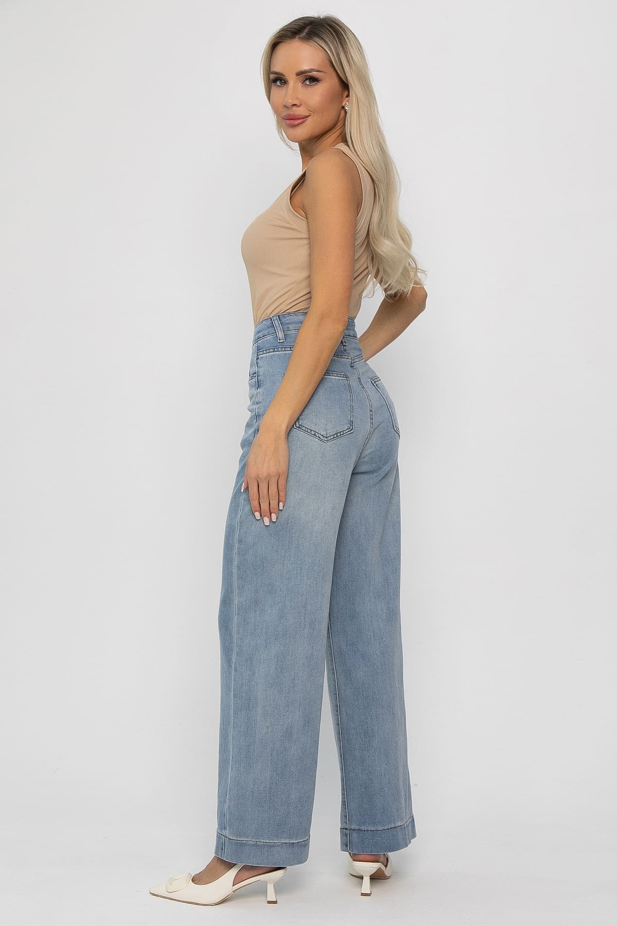 Джинсы-кюлоты в серо-голубом цвете — это то, что нужно тем, кто ищет удобные и модные вещи, которые гармонично впишутся в любой гардероб. На талии есть планка для ремня, которая плавно переходит в застёжку на пуговицу с молнией. Переднюю часть украшают забелённые горизонтальные полосы, которые придают изделию уникальный вид. Есть функциональные карманы спереди и сзади.