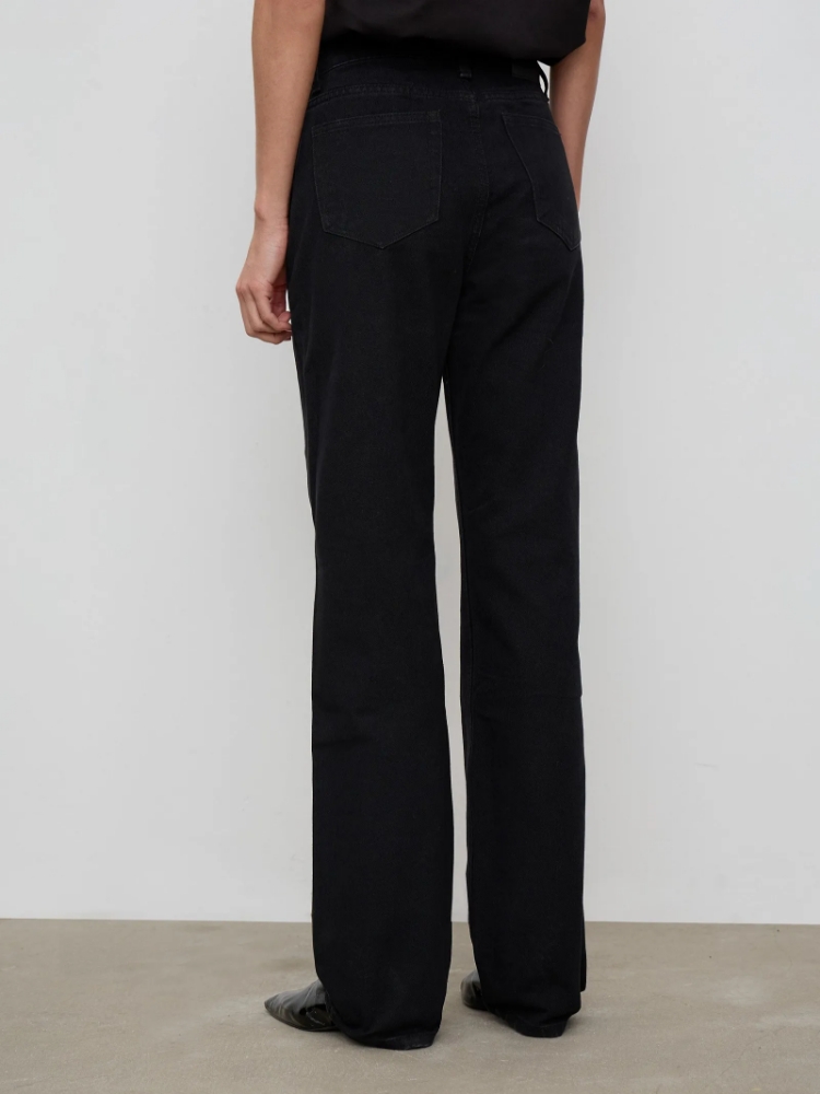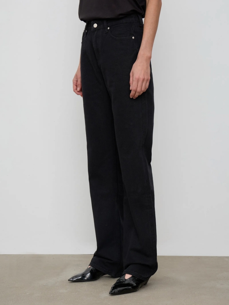 Стильные чёрные джинсы из натурального хлопка незаменимы в повседневном гардеробе. Базовая модель прямого кроя с высокой посадкой дополнена накладными карманами сзади. Джинсы комфортно садятся по фигуре и стильно смотрятся в любом образе на каждый день. Дополнить можно трикотажным топом, атласной рубашкой и другими интересными вариантами