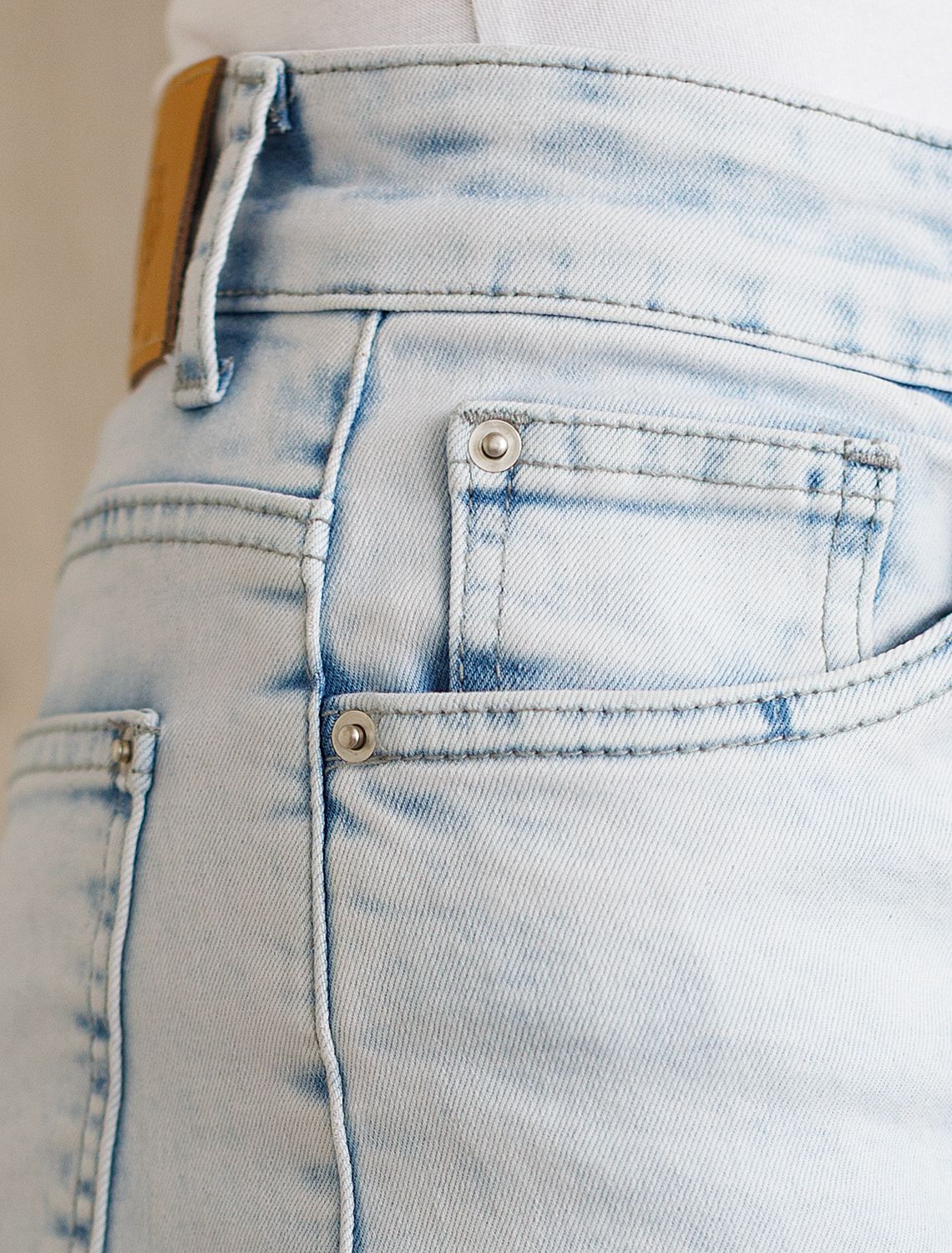 Джинсы трубы светло-голубого цвета выполнены из эластичного денима плотностью 13,7 OZ - классическая структура, которая отлично держит форму.и подчеркивает фигуру. После пошива изделие подвергли специальному виду вошинга — salt-stone washing (солт-стоун вошинг), что дословно значит стирка с каменной солью. Такой вид вошинга позволяет получить стильные потертости на голубых оттенках денима. Джинсы прямого кроя визуально вытягивают силуэт, благодаря эластану в составе аккуратно садятся на любую фигуру и обеспечивают максимальный комфорт в течение дня, не сковывая движения. Широкая размерная линейка подходит для разных типов фигур: свободные джинсы комфортны как для обладательниц пышных форм, так и для худеньких. Плотные джинсы идеально держат форму даже при активном движении и не вытягиваются после долгой носки. Качественная фурнитура и нашивка из эко-кожи с логотипом бренда делают эти джинсы премиальными. Широкий крой добавляет актуальности — такие джинсы отлично сочетаются как с обувью на каблуке, так и на плоском ходу. Благодаря универсальному дизайну джинсы легко комбинируется с разными элементами гардероба.