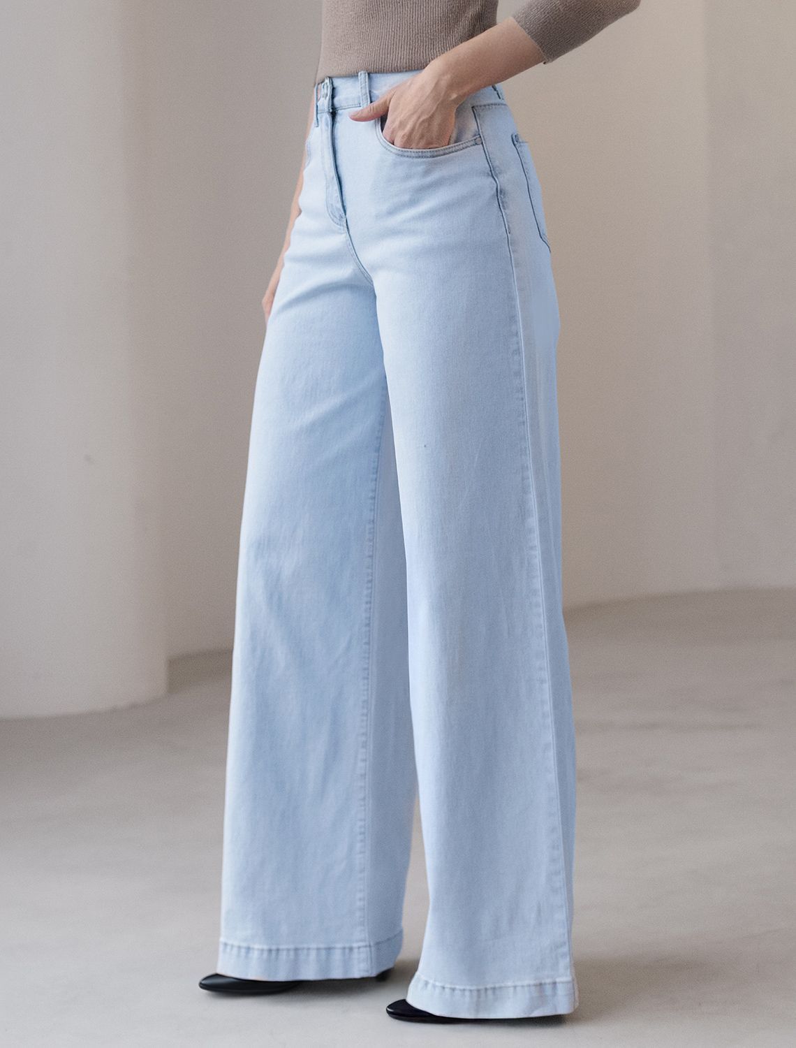 Рост 172, бюст 88, талия 64, бедра 88 Джинсы-трубы выполнены из эластичного тонкого денима. Модель в голубом оттенке с легкой стиркой свободного кроя с посадкой на талии визуально вытягивает ноги и удлиняет силуэт. Хорошо подойдут для расслабленных повседневных, уличных и офисных образов. Сочетаются с любым верхом от повседневного до классического.