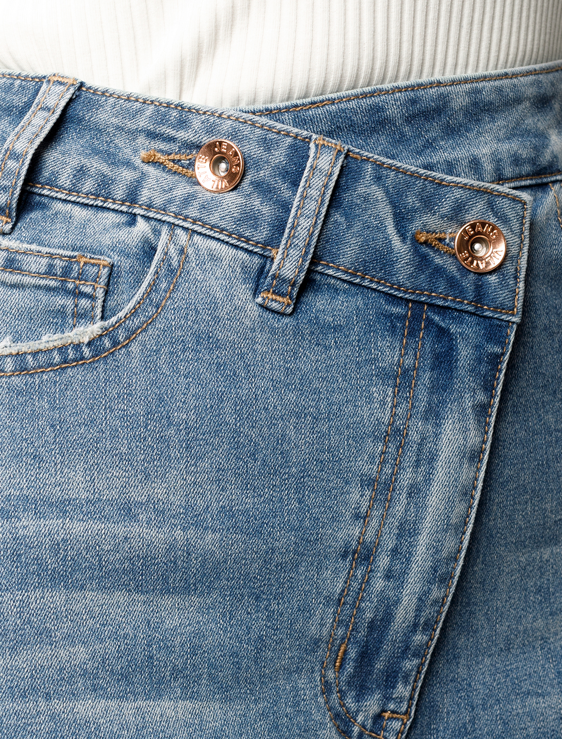 Джинсы-трубы в синем оттенке выполнены из эластичного денима. Модель с трендовой ассиметричной застежкой и декоративной стиркой эффектом делаве. Свободный силуэт и акцент на талии визуально вытягивают силуэт и подчеркивают достоинства фигуры. Изделие дополнено брендированным патчем. синий