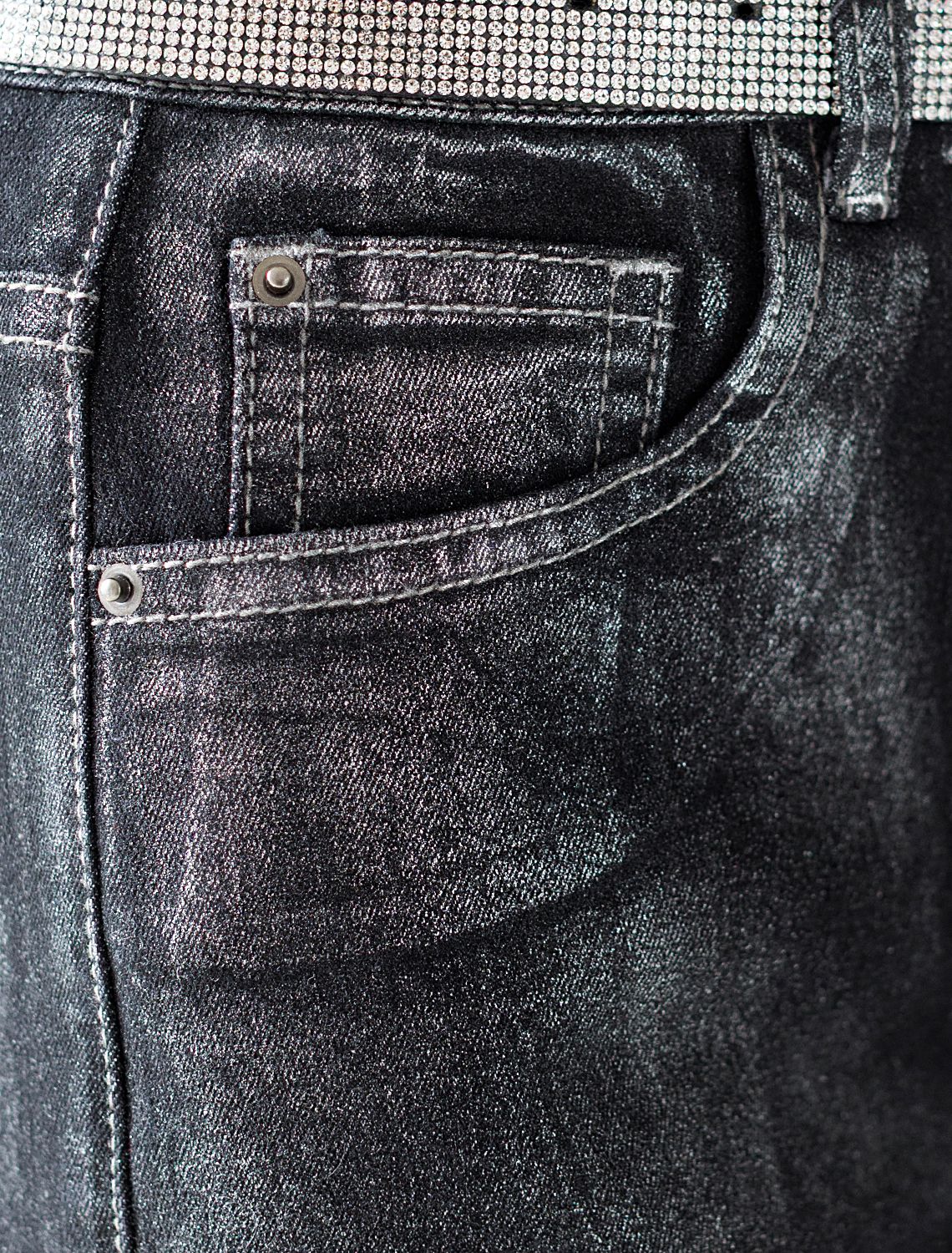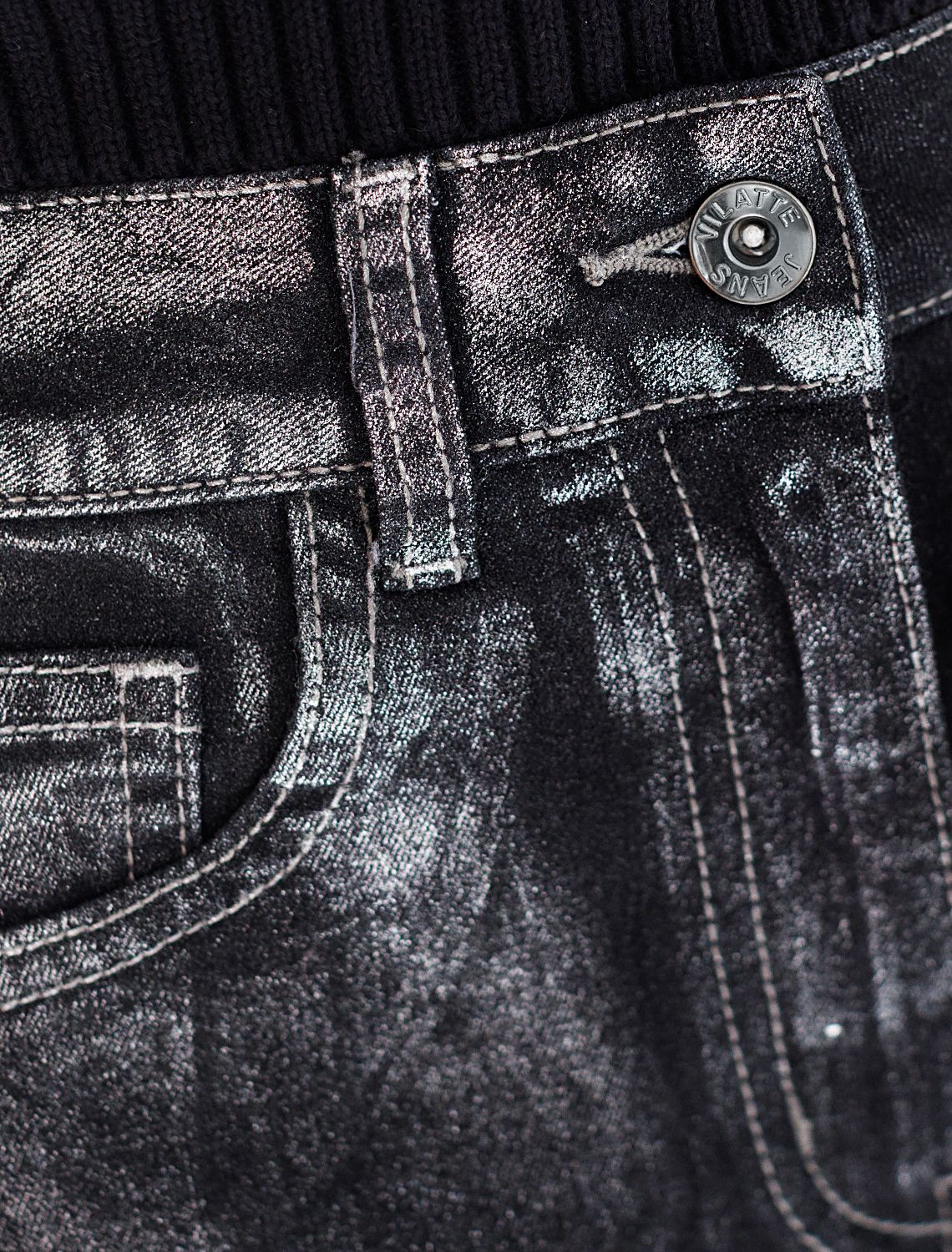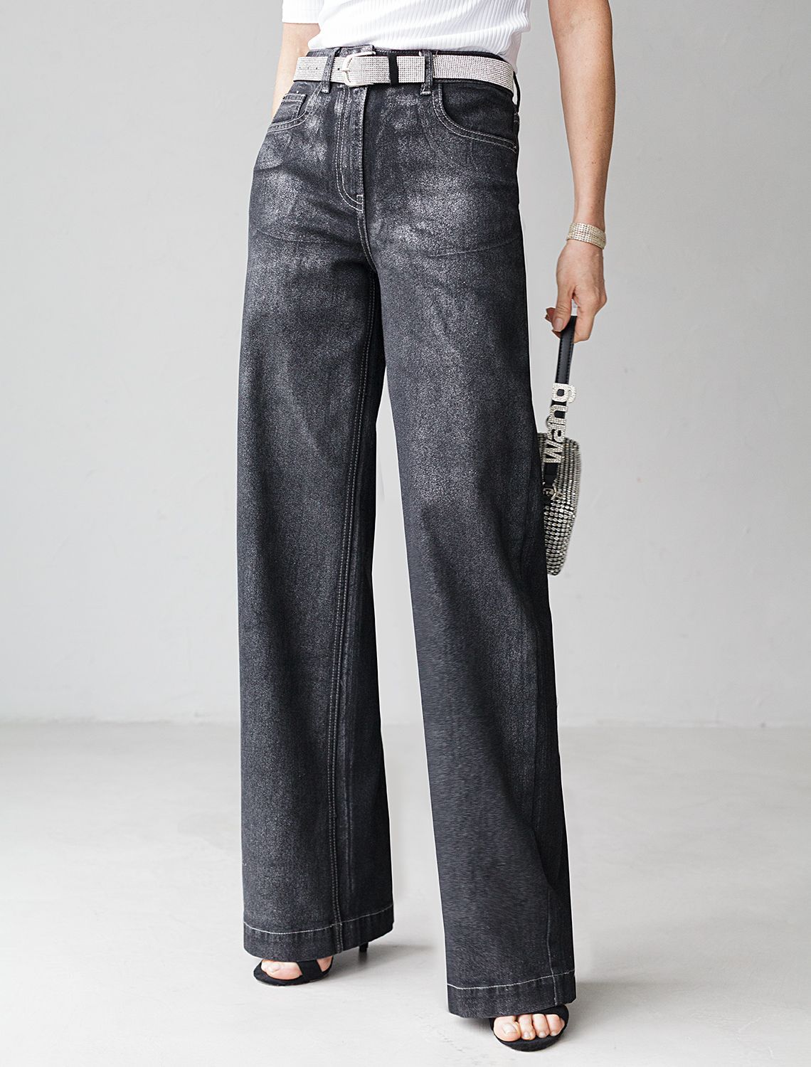 Стильные джинсы трубы выполнены из эластичного денима, который комфортно садится на любую фигуру, в том числе большие размеры, и обеспечивает свободу движений. Благодаря декоративному металлизированному покрытию материал приобретает эффект варенки и придает модели уникальный характер, подчеркивая индивидуальность и современный вкус. Прямые свободные джинсы формируют красивый силуэт и визуально вытягивают ноги, подчеркивая достоинства фигуры. Снизу предусмотрен аккуратный широкий подгиб, который добавляет завершенности образу. Материал отличается высокой плотностью и эластичностью, что обеспечивает долговечность изделия. Эти стильные джинсы металлик созданы для тех, кто ценит сочетание удобства и яркого внешнего вида в повседневной одежде. Джинсы с эффектом металлик — довольно броский элемент гардероба, поэтому верх лучше выбирать лаконичного дизайна, чтобы не перегрузить образ, например, однотонные футболки, блузки или свитера, а кожаная куртка в осеннем луке в комплекте с этими джинсами добавит образу динамичности, при этом сохраняя женственность.