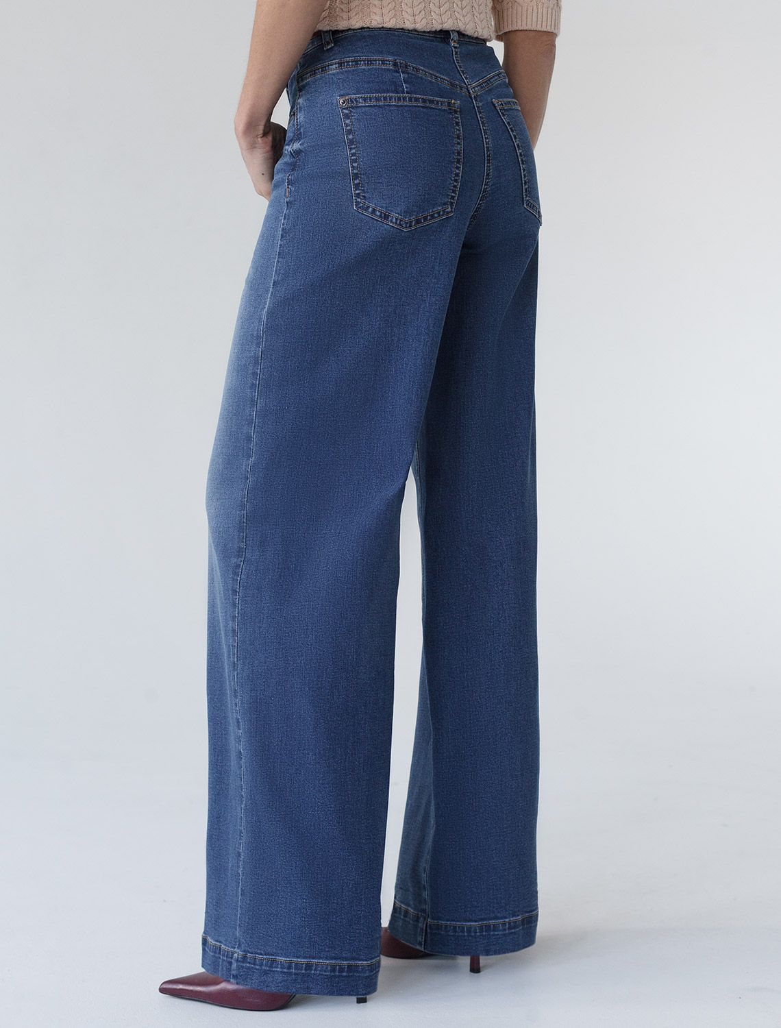 Стильные джинсы трубы синего цвета прямого кроя выполнены из эластичного денима, что делает их особенно удобными для повседневной носки. Декоративная стирка подчеркивает современный дизайн. Джинсы правильного кроя визуально вытягивают силуэт, благодаря эластану в составе аккуратно садятся на любую фигуру, подчеркивая достоинства и обеспечивают максимальный комфорт в течение дня, не сковывая движения. Широкая размерная линейка подходит для разных типов фигур: свободные джинсы комфортны как для обладательниц пышных форм, так и для худеньких. Вы сможете подабрать джинсы на низкий или высокий рост. Плотные джинсы идеально держат форму даже при активном движении и не вытягиваются после долгой носки. Качественная фурнитура, практичные карманы и контрастная строчка делают эти джинсы премиальными. Широкий подгиб добавляет актуальности — такой тренд отлично сочетается как с обувью на каблуке, так и на плоском ходу. Благодаря универсальному дизайну джинсы легко комбинируется с разными элементами гардероба.