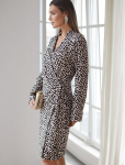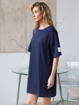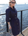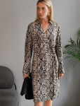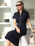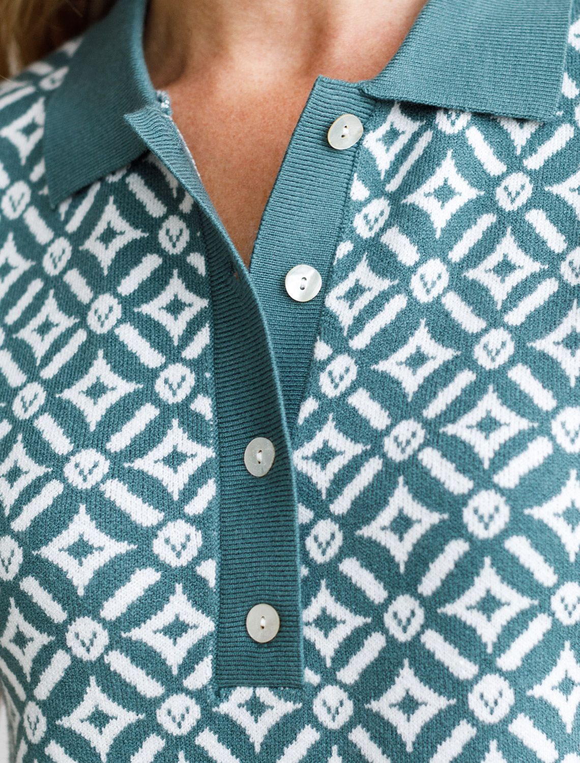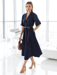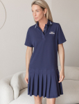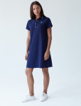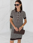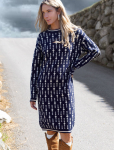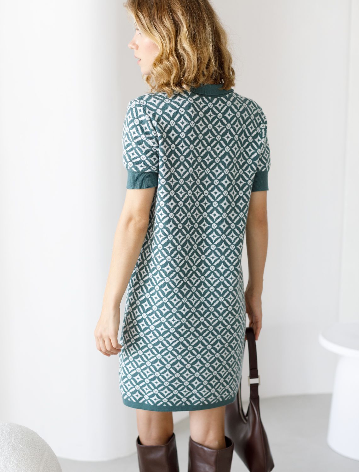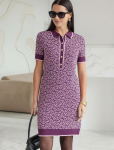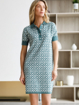 Платье длины мини с воротником поло выполнено из мягкого трикотажа на основе шелковистой эластичной вискозы. Жаккардовое переплетение образует геометрический узор. Застежка на перламутровые пуговицы подчеркивает гладкость пряжи. Контрастный воротник и манжеты делают узор еще более выразительным. Можно сочетать с жакетом D31.388 из жаккардовой коллекции.