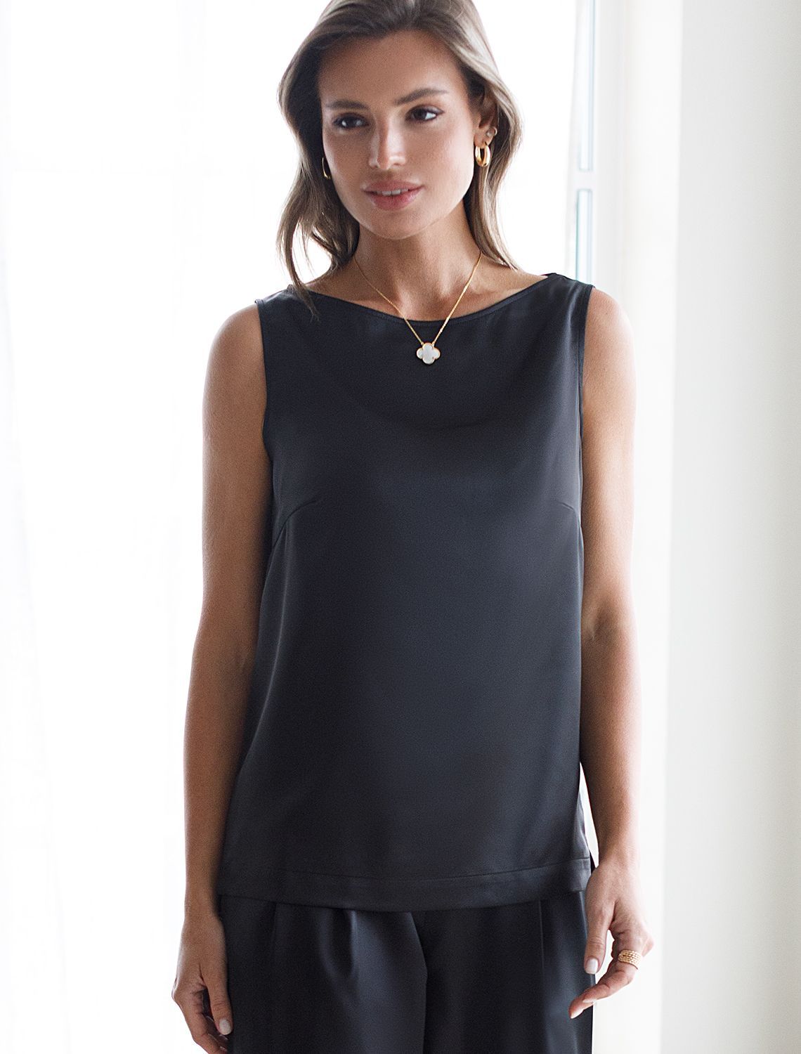 Изящный нарядный топ черного цвета выполнен из нежного премиального сатина с небольшим добавлением эластана. Свободный крой обеспечивает комфорт, легкость и свободу движений, подчеркивая изысканность образа и женственность силуэта. Особое внимание привлекает мягкий приглушенный блеск материала, придающий топу дорогое и утонченное звучание. Натуральный материал отличается приятной текстурой и долговечностью, что гарантирует долгий срок службы топа. Благодаря струящейся, но плотной ткани, топ мягко ложится по фигуре, придавая легкость и подчеркивая достоинства любого типа фигуры. Приятная на ощупь текстура и хорошая воздухопроницаемость - делает повседневный топ отличным выбором для теплого времени года или для носки в помещении. Топ подойдет как на большие размеры, так и на маленькие — универсальность фасона позволяет чувствовать себя уверенно вне зависимости от комплекции. Декольте оформлено аккуратно, создавая эффектный акцент без излишней открытости.